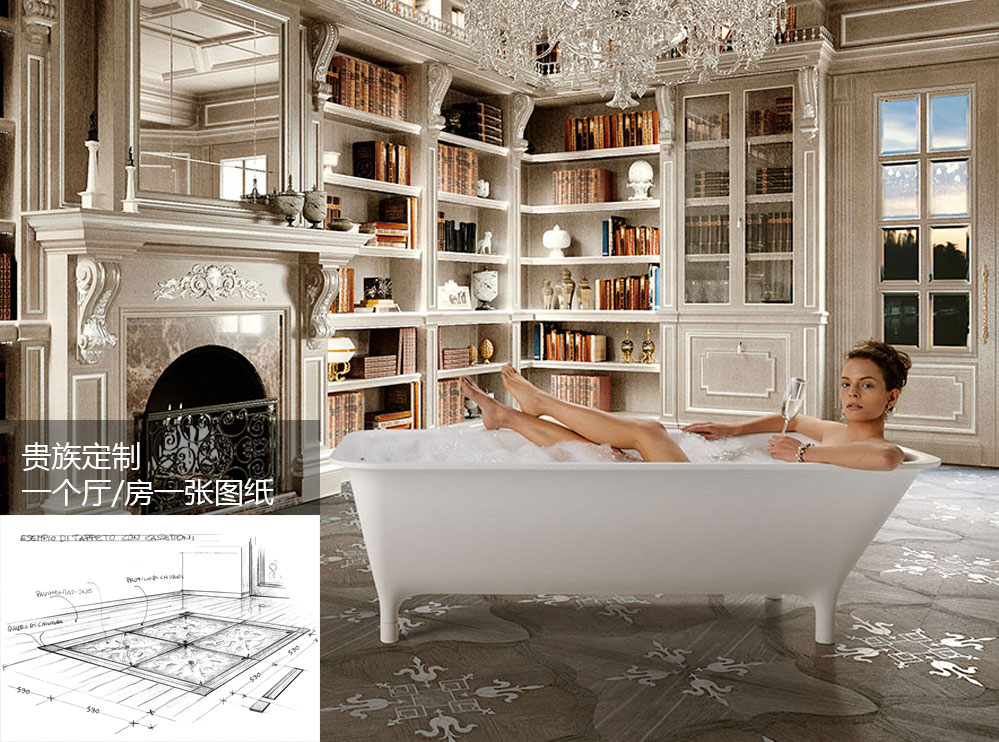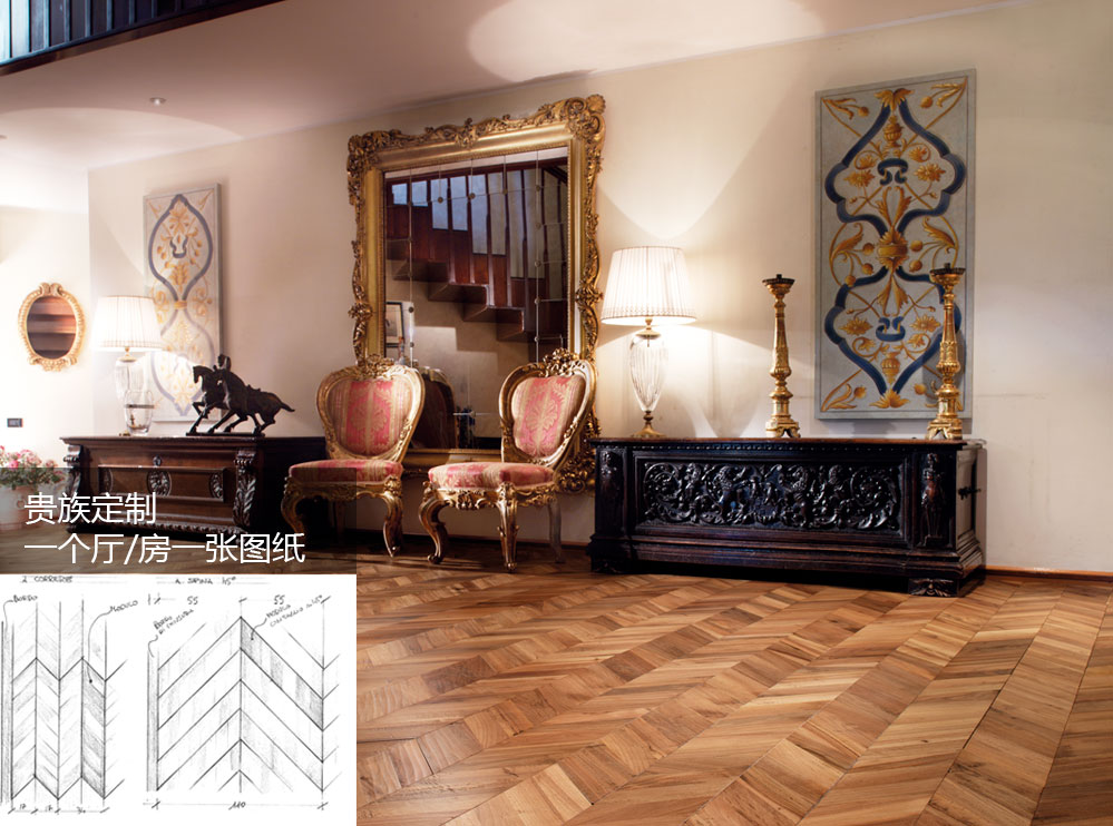 菲列德羅全部由意大利設計師針對上流社會交付的家居裝修平面圖,進行一對一的個性化定制設計、并由工藝精湛的威尼斯工匠,根據該系列圖紙逐片地板手工制作,一個廳/房一張圖紙,一個整托的包裝地板安裝一廳/房,產品制造后直接從意大利進口運送到中國,由專業技工根據意大利圖紙完成鋪裝。整個過程為高級度身定制的一對一服務。