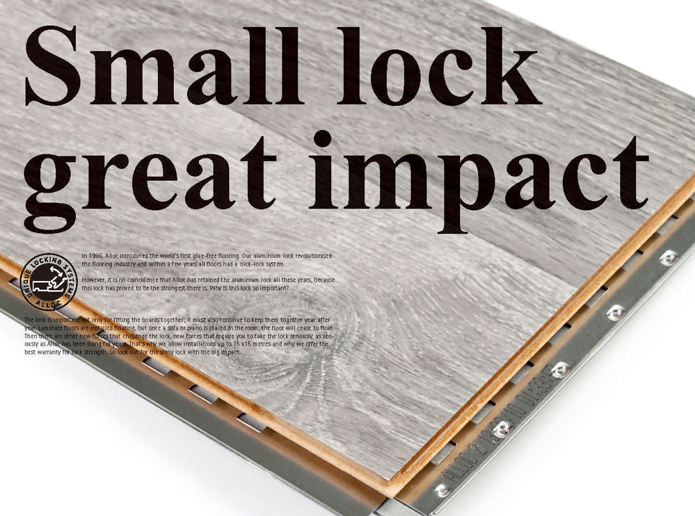 ALLOC致力設(shè)計(jì)研發(fā)品質(zhì)超群的卓越復(fù)合地板。從研發(fā)、制造、運(yùn)輸?shù)桨惭b調(diào)試,所有工序都有條不紊地進(jìn)行。全球獨(dú)家金屬鋁合金鎖扣,拉力達(dá)1200KG/M,比一般鎖扣強(qiáng)1.5倍。