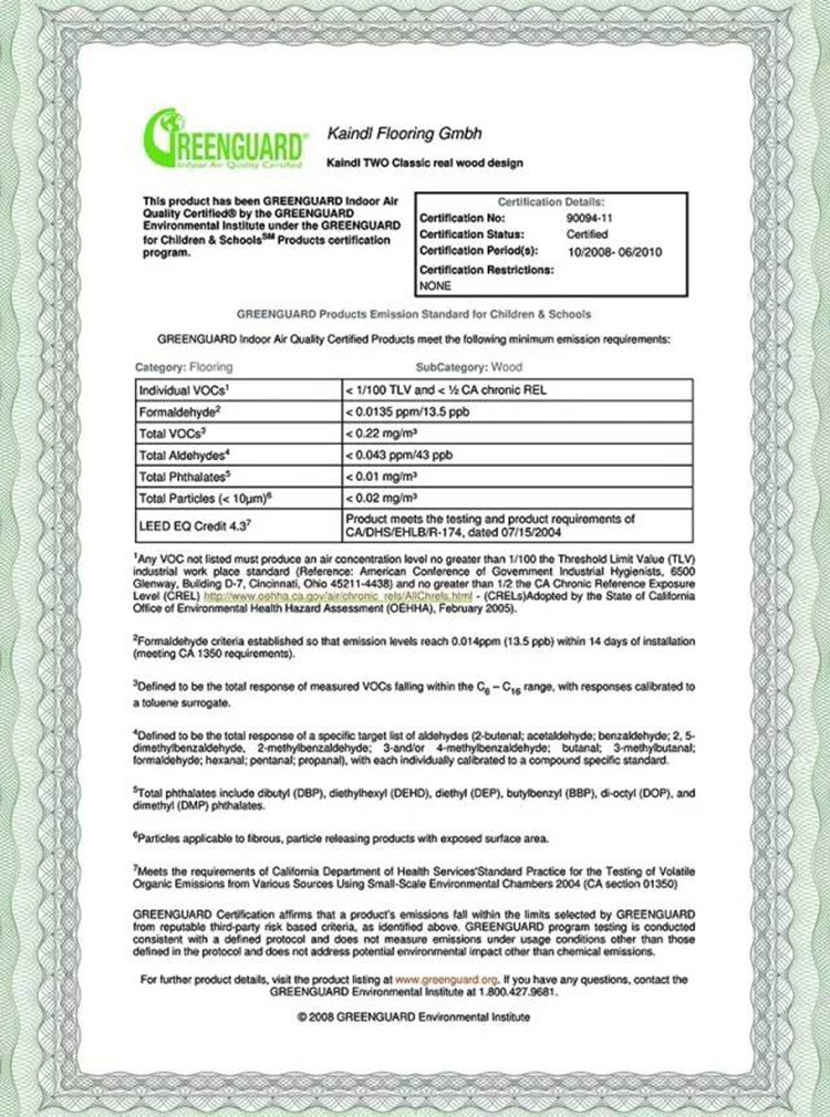 德國舒納雅爾(schoener-wohnen)地板沿襲了德系制造的環保要求,取材于PEFC和FSC認證的森林,并堅持每砍伐一棵樹就種一棵樹的原則,擁有多項世界領先的技術大獎,獲得過德國藍天使環保認證、PEFC泛歐森林環保認證和歐盟CE國家品質標準認證等多項環保認證。
