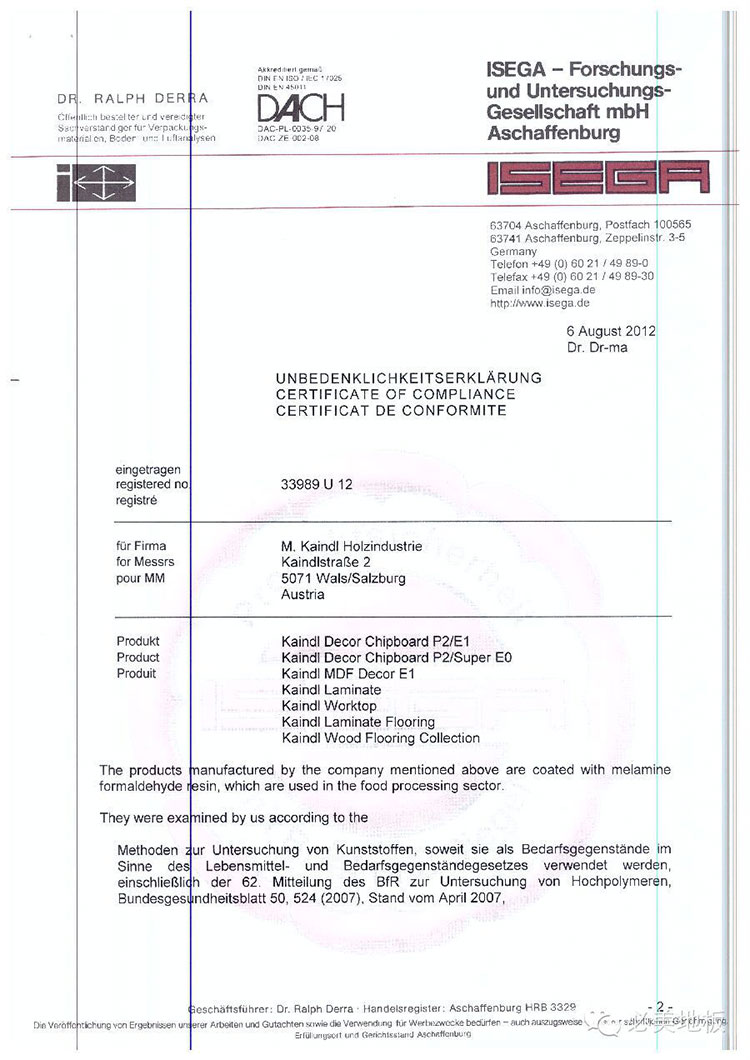 目前歐美國家對于家居建材環(huán)保質(zhì)量測試能夠給出權(quán)威認證的主要機構(gòu)是德國ISEGA實驗制訂的歐洲食品級安全認證,可以提供多達上千種的科學(xué)測試以及安全性聲明。ISEGA是德國知名的檢測機構(gòu),它作為歐盟乃至全世界食品藥品監(jiān)管的最高機構(gòu),為整個行業(yè)評測監(jiān)管提供最高準則。其出具的歐洲食品級安全檢測報告與證書被廣大歐洲甚至全球的用戶支持與認可。凱得集團獲得ISEGA歐洲食品級安全認證,證明凱得所生產(chǎn)的地板可以達到食用級的環(huán)保健康安全標準。