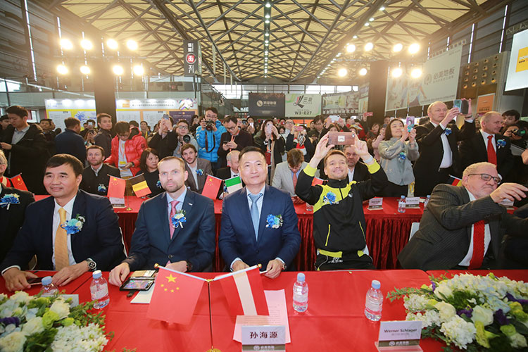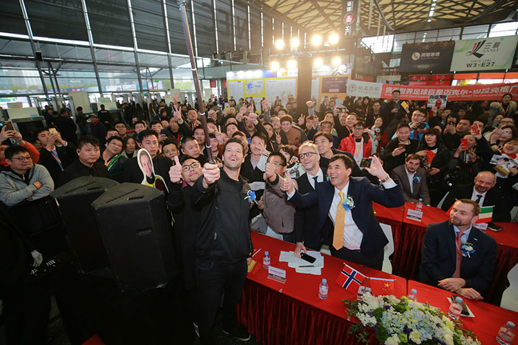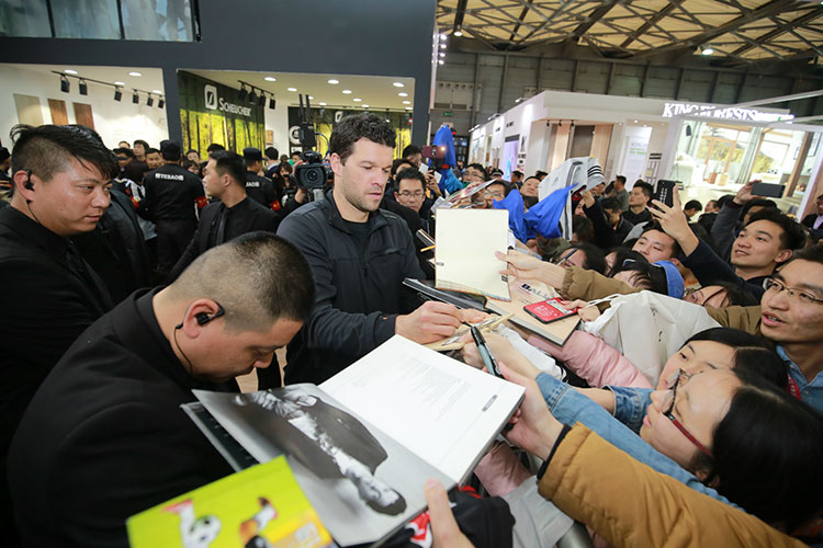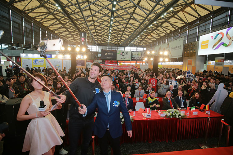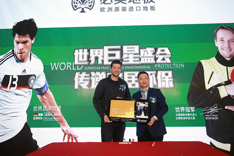 聽聞巨星降臨,從上午9點開始,必美地板展廳就不斷涌入大量觀眾,大家一邊欣賞廳內展出的精品地板,一邊翹首等待兩位球星的到來。10點半,巴拉克和施拉格終于現身必美地板,立即引起館內轟動,人潮涌動中,全場舉起了一片手機之海,像是在掃福,幸好我們的球星都擁有傲人的身高,足以讓大家望見真容。上午11點,必美地板在南大廳舉行了“世界巨星盛會 傳遞家居環保”的新聞發布會,必美國際集團總裁孫海源先生開場致詞,對各位嘉賓的到來表示熱烈的歡迎,順祝上海地材展20周年節日快樂。上海萬耀企龍展覽的總裁仲剛先生也對必美的活動表示出十分的期待。萬耀企龍和必美地板雙方建立了長期的戰略合作關系,多年來發揮各自優勢,整合資源,實現了共同發展,未來雙方也將繼續同舟共濟,為中國的環保家居事業注入更多激情和動力。