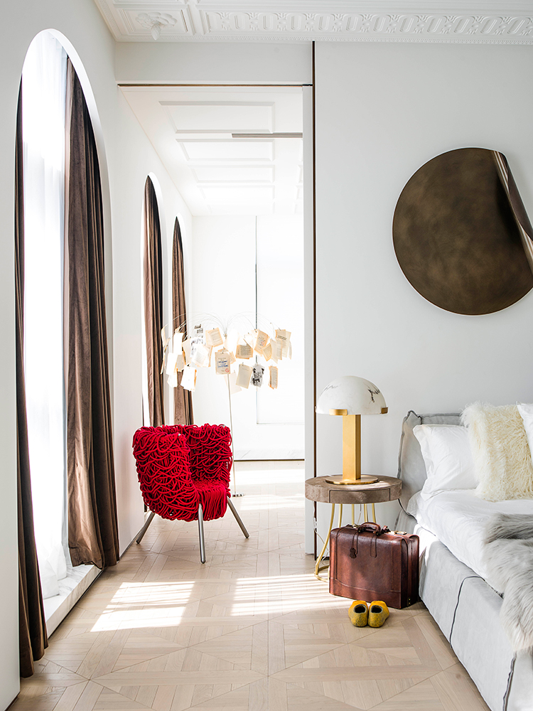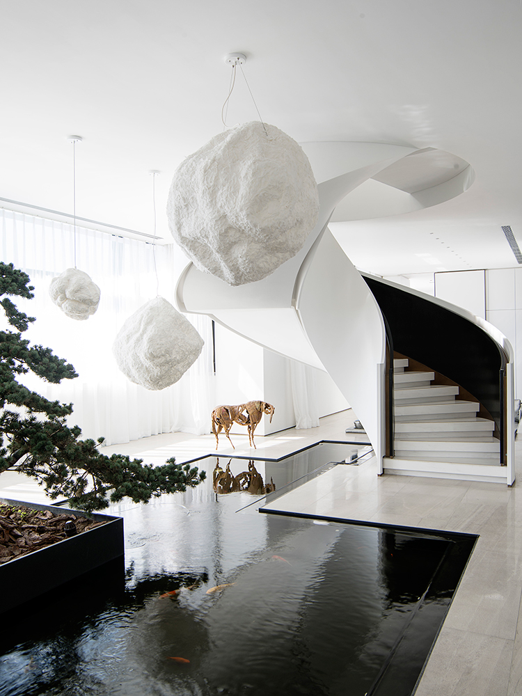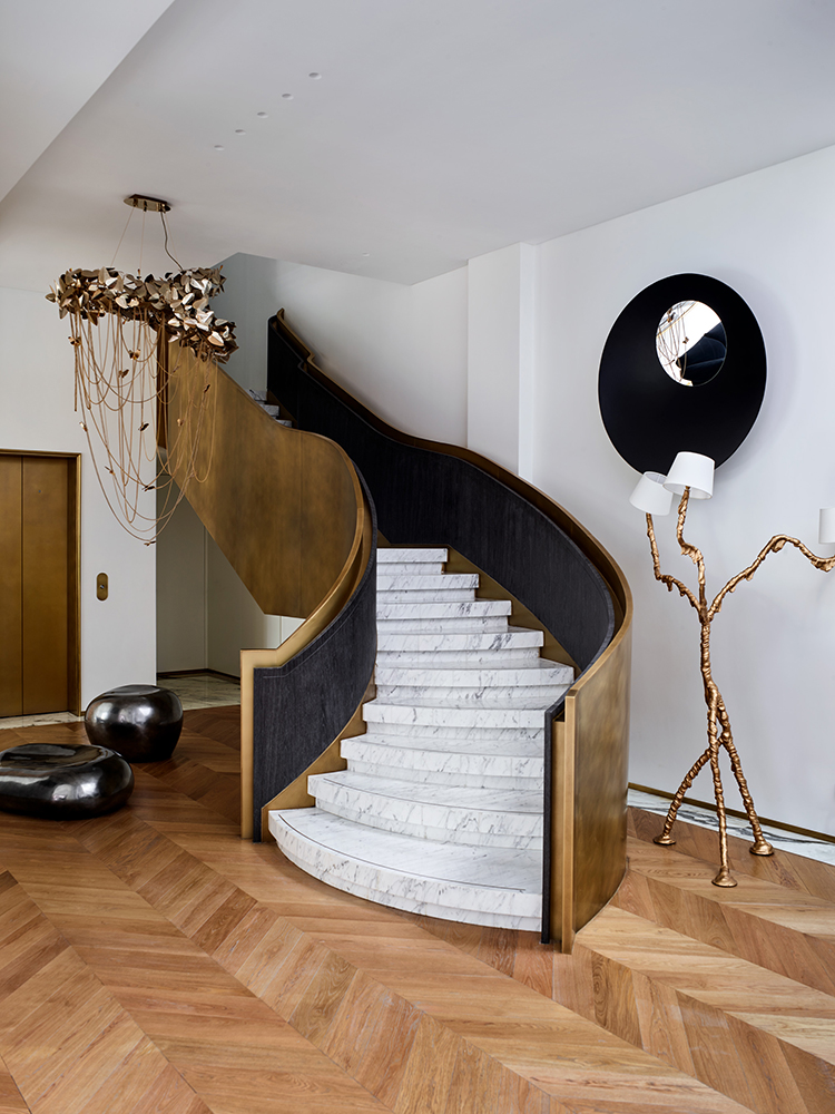 這處私宅是孟也于2017年中秋交付的一件作品,遵循設(shè)計(jì)的最高境界是“不設(shè)計(jì)”理念,在挑空的東廳引入“減法”,去除為了表現(xiàn)品質(zhì)而刻意存在的護(hù)墻板、金屬、木質(zhì)表皮等,轉(zhuǎn)而以簡(jiǎn)潔詮釋之。家具的選擇更加熱烈而直接,圓形的“平步青云”旋轉(zhuǎn)樓梯,“在現(xiàn)代之中找到古典,在古典之中窺探現(xiàn)代”的主臥,所有的一切都關(guān)乎人性,貼合“現(xiàn)代”的性格,構(gòu)建與心一致的生活狀態(tài)。“不標(biāo)榜風(fēng)格、尊重生活,所以我呈現(xiàn)的一切都是圓潤(rùn)的。”