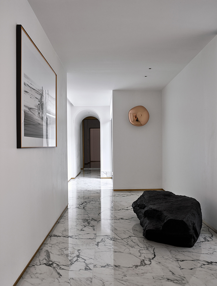 孟也對(duì)于楊坤的理解是有個(gè)性、有性情、有力量、有藝術(shù)感的人,于是就用一種藝術(shù)館式的方式來(lái)營(yíng)造他的家。在明確整體系統(tǒng)的空間體驗(yàn)感,把控不同空間的設(shè)計(jì)連貫性、動(dòng)線和節(jié)奏之后,用藝術(shù)貫穿古典與現(xiàn)代,將經(jīng)典糅合起來(lái)。設(shè)計(jì)中保留足夠多的留白,為以后添置更多藝術(shù)作品、裝置留下空間,同時(shí)通過(guò)巴洛克式的吊頂、新古典主義的踢腳線等細(xì)節(jié)來(lái)營(yíng)造空間的變化,緩解大量留白帶來(lái)的沉悶和單調(diào)。在色彩系統(tǒng)上,以白色、深灰和金色為主色;不同空間再分別營(yíng)造不同的色彩比例及用色特點(diǎn),以此來(lái)確保整體性和各個(gè)小空間的獨(dú)立性。