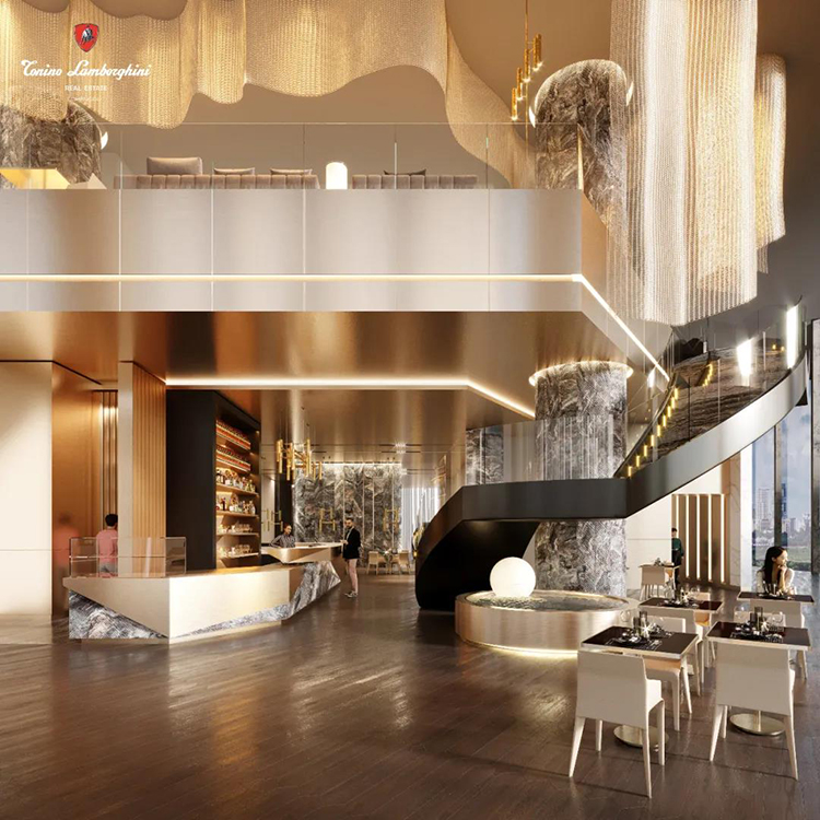 與接引大堂區(qū)域緊密相連的咖啡廳,以連貫的原木色金屬質(zhì)感為打造重點(diǎn),讓整個(gè)空間的奢華感得到極大的提升。柔和的光線加之于舒適的桌椅,創(chuàng)造出了點(diǎn)滴的細(xì)膩深淺變化。大理石圓柱與旋轉(zhuǎn)樓梯順勢而上,與行云流水般的吊燈形成呼應(yīng),一靜一動(dòng)增加了空間的對(duì)比和張力。未來的<Tower A>首層更將引入全球首家托尼洛·蘭博基尼品牌咖啡旗艦店,旨為帶來純粹的意式奢享體驗(yàn)。