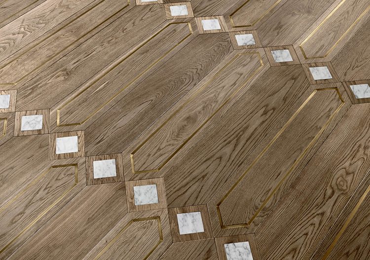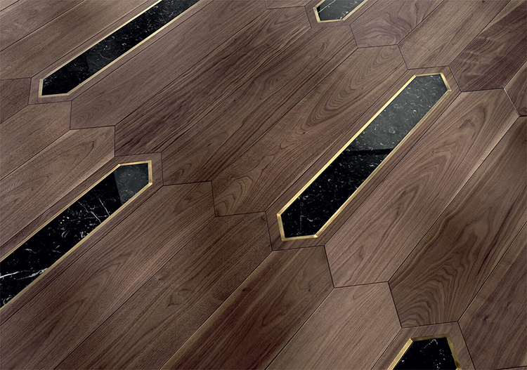 大堂鋪裝的是必美代理的意大利菲列德羅的鉛筆拼花地板,由意大利天才設(shè)計(jì)師法比奧.羅泰拉操刀設(shè)計(jì)。采用美國胡桃木、歐洲胡桃木和橡木三種珍貴木材為原料,地板中鑲嵌了具有典雅觸感的拋光銅金屬、卡拉拉大理石和黑白根大理石等,形成5種精致復(fù)雜的花色,個(gè)性化的色彩搭配和形狀組合讓地板呈現(xiàn)出與眾不同的精彩。