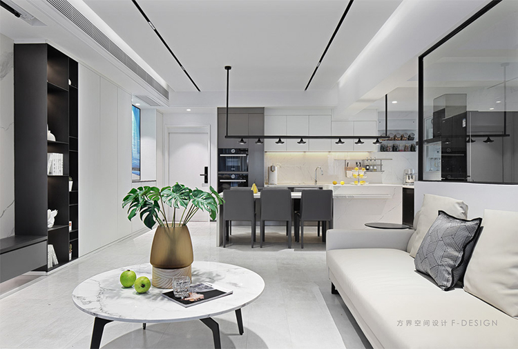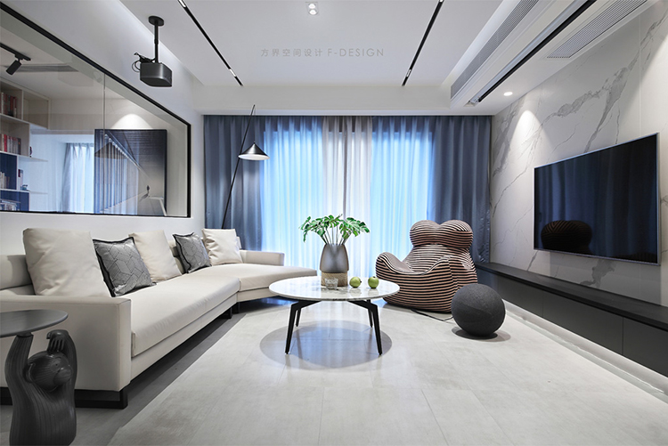 我們在天花設(shè)計時盡可能的讓空間高上去,包括電視上方的空調(diào)機位我們也放了個投影儀的功能進(jìn)來,業(yè)主二人在快節(jié)奏的工作休閑之余,可以放音樂看電影。磁吸燈的運用在空間線條的運用也為我們的現(xiàn)代風(fēng)格加分不少。