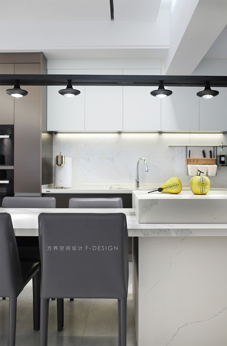 餐廳空間是日常生活的重心之地也是體現(xiàn)家的氛圍之處。開放式廚房最重要的是擁有一個島臺,簡單大氣的巖板餐臺也延續(xù)了客廳的,配上舒適的餐椅,搭配吊燈,開燈的瞬間溫暖整個空間。