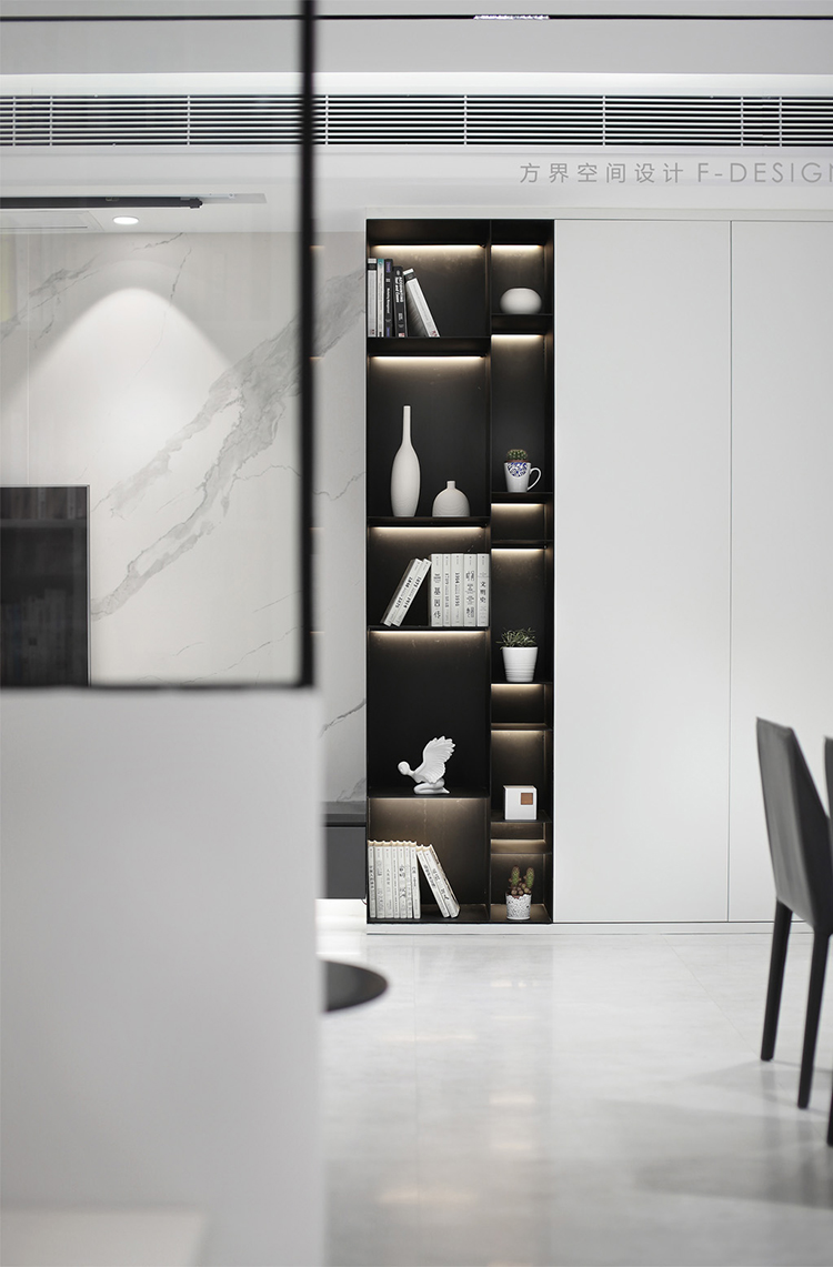 在走道位置看向玄關(guān)柜體,空間里黑白相間的材質(zhì)搭配,空間里干干凈凈。