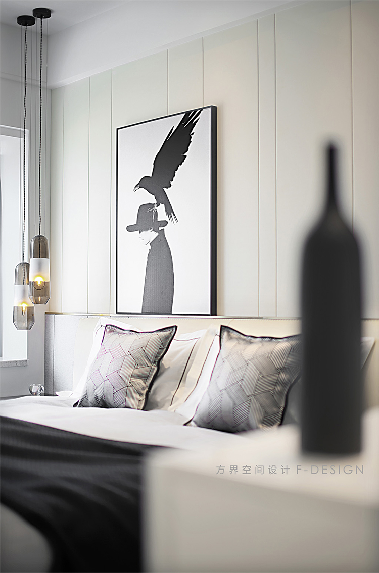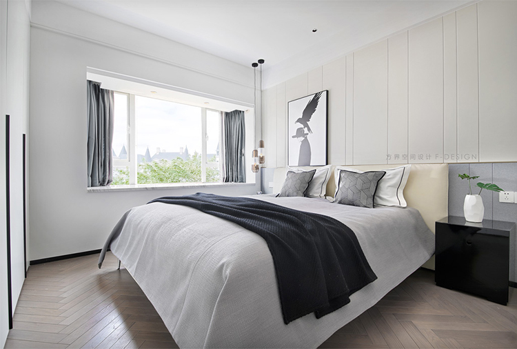 次臥床頭一側(cè)吊溫馨小吊燈,增加氛圍光。房間沒有太多的裝飾物,采用極簡的配色,追求空間寬敝。