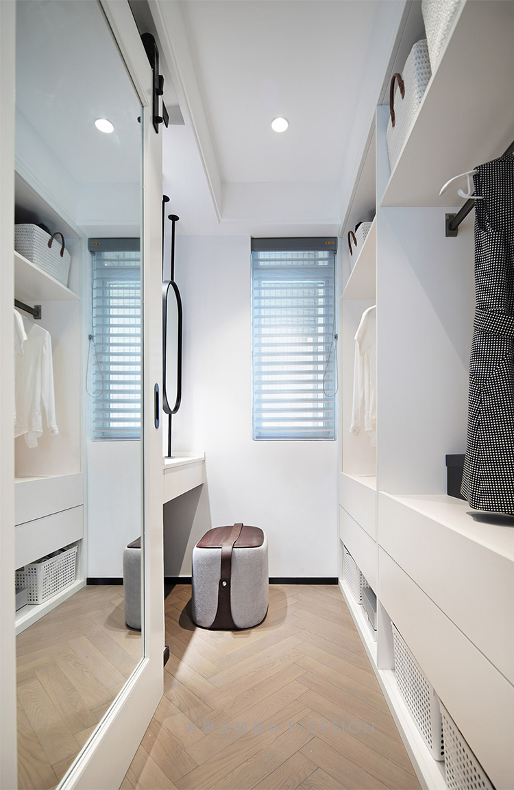 衣帽間必備一個梳妝區(qū)域,梳妝臺搭配個性實用鏡子,看似簡單卻極具品味,空間雖小卻也不擁擠,暖色調(diào)的光線提升衣帽間格調(diào)。