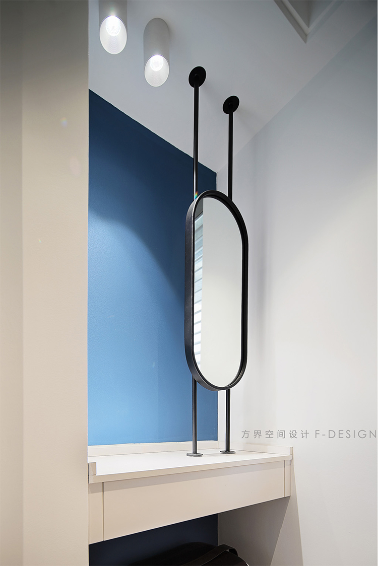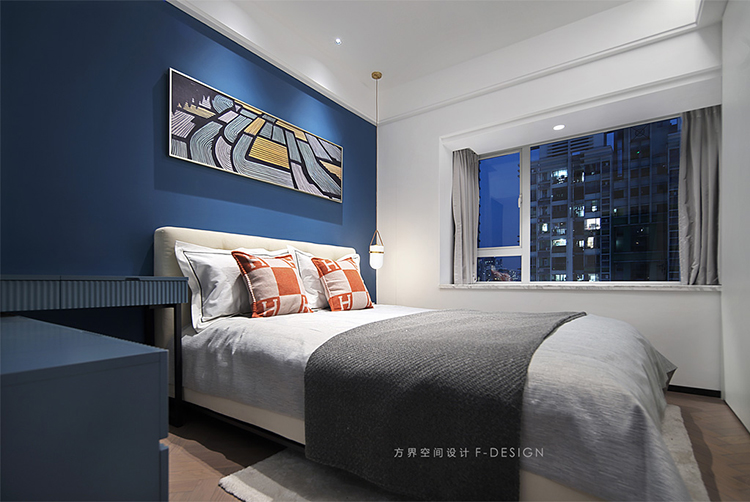 而以藍(lán)色為床頭背景墻顏色作為點綴,活躍了空間,空空的墻面,搭配掛畫,在極簡中生出樂趣。