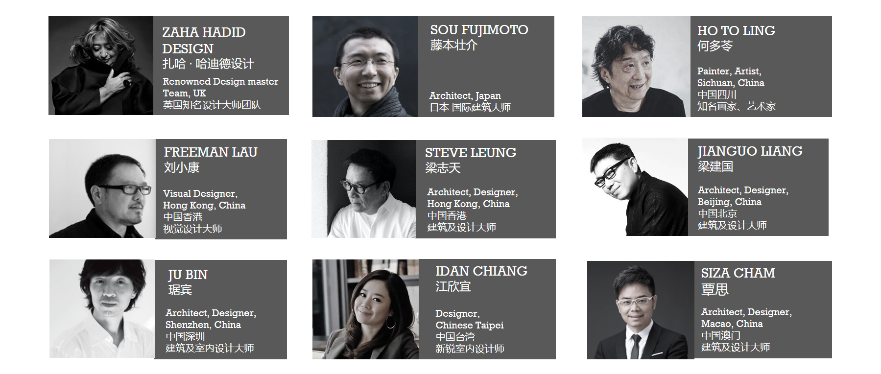 首屆IDC邀請了全球最負盛名的八大建筑及室內設計大師:英國知名設計大師團隊扎哈·哈迪德設計,國際建筑大師藤本壯介,知名畫家&藝術家何多苓,視覺設計大師劉小康,建筑及設計大師梁志天、梁建國,建筑及室內設計大師琚賓,新銳室內設計師江欣宜和建筑及設計大師覃思,共建大師之家。