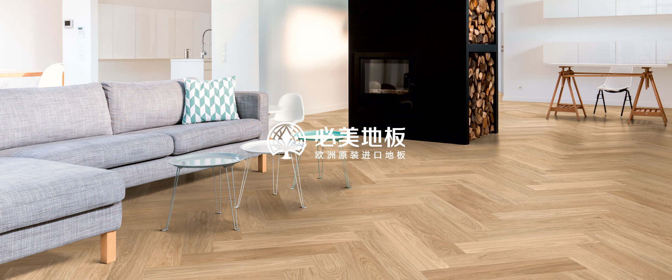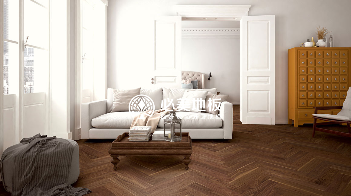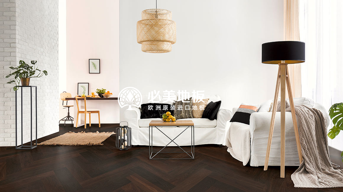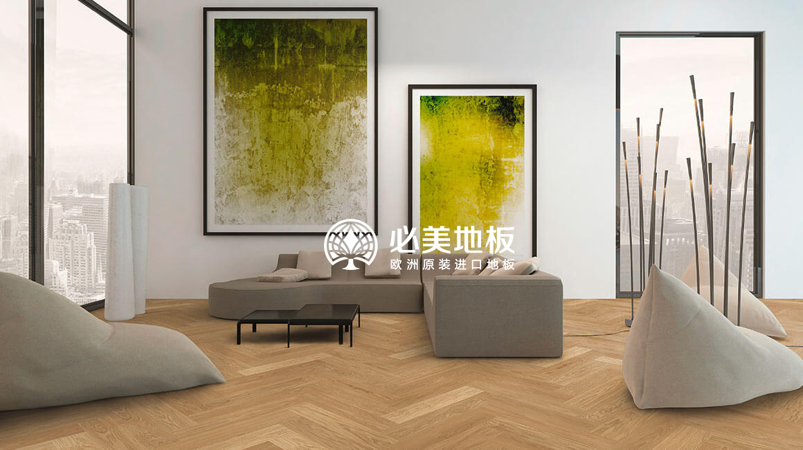 頂層的360°豪景客廳鋪設了立體感超前的人字拼木地板,讓這座空中樓閣多了生活的溫度。在必美,也有匹配如此頂奢之美的地板產品。