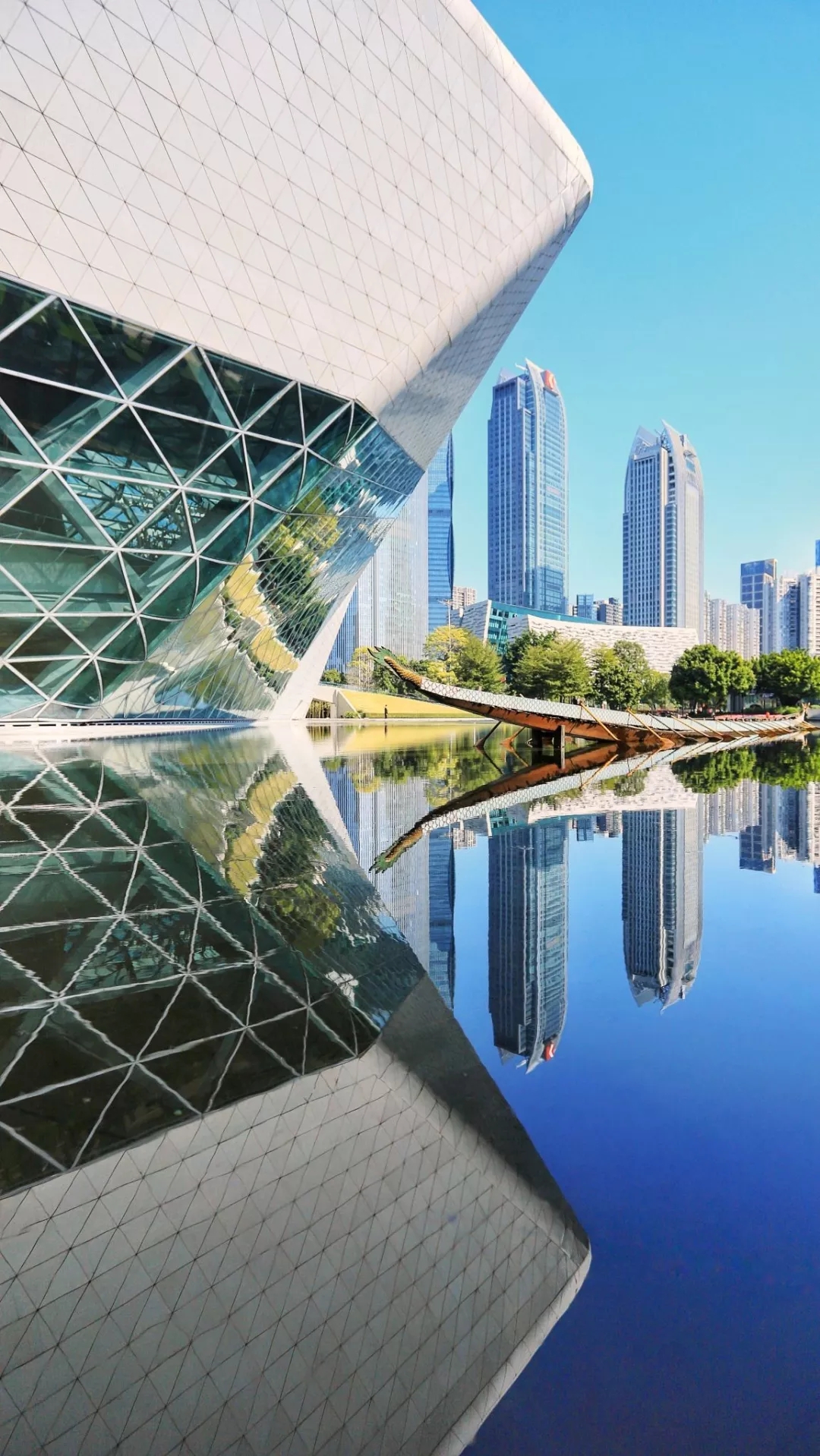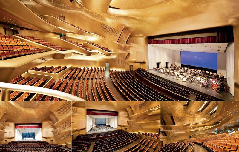 造型粗野、獨特,主體建筑“圓潤雙礫”,隱喻由珠江河畔的流水沖來的兩塊漂亮石頭。劇院的設計受到河谷概念及卵石受侵蝕的影響,切割強烈的內部和外部峽谷,形成了交通、大堂和咖啡館空間,并將自然光線引入建筑內部。如今的廣州大劇院早已成為知名的廣州文化地標,提高了整座城市的文化藝術水平。