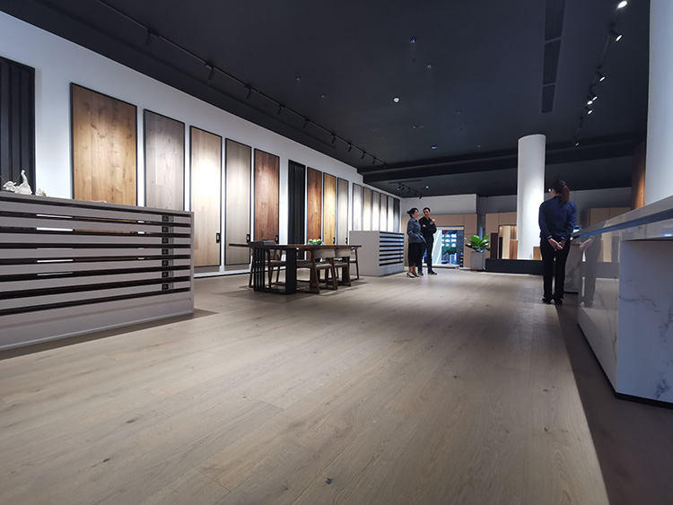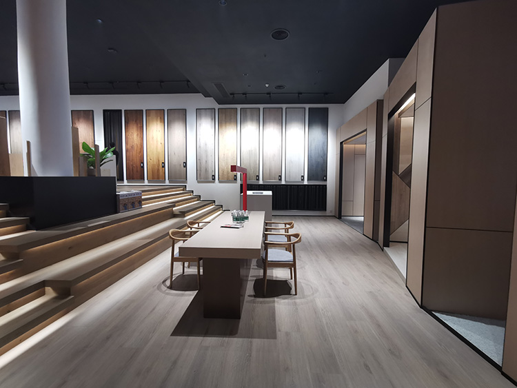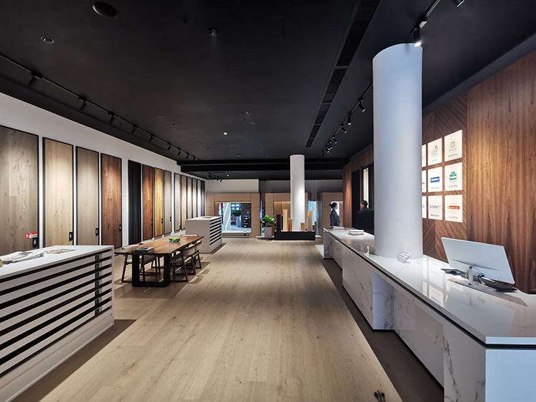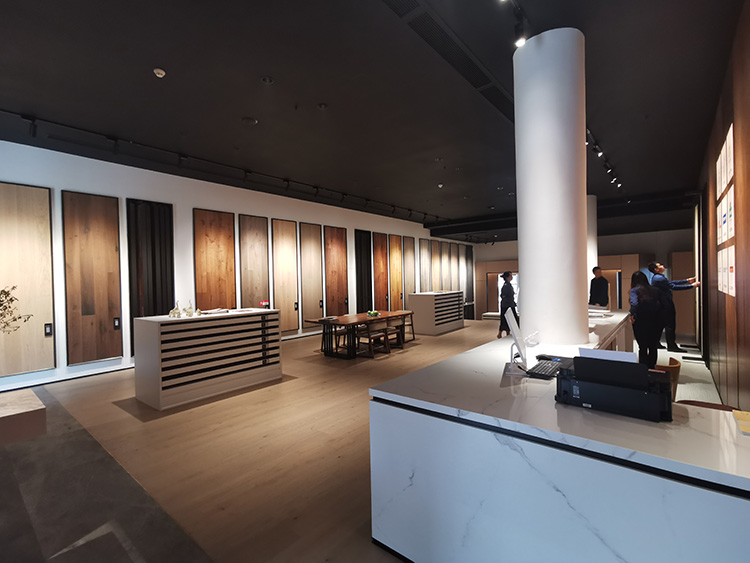 開放、低調、簡而有奢,整個臻品館以地板為介,以燈光為線,科學的動線設計引導人流走動,豐富的地板樣品帶來強大的視覺沖擊力。邵唯晏團隊通過理性精準地分割與重塑空間,讓臻品館的豐富內在如藝術畫廊般錯落有致地呈現在觀眾面前。
