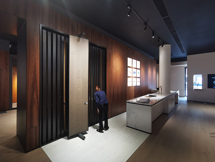 在非主體空間中,通過L或U型的盒體加以場景化故事性的打造,豐富了空間趣味性,也滿足了地板展示的需求,環島組合式的擺放可以讓顧客進行自主了解體驗。