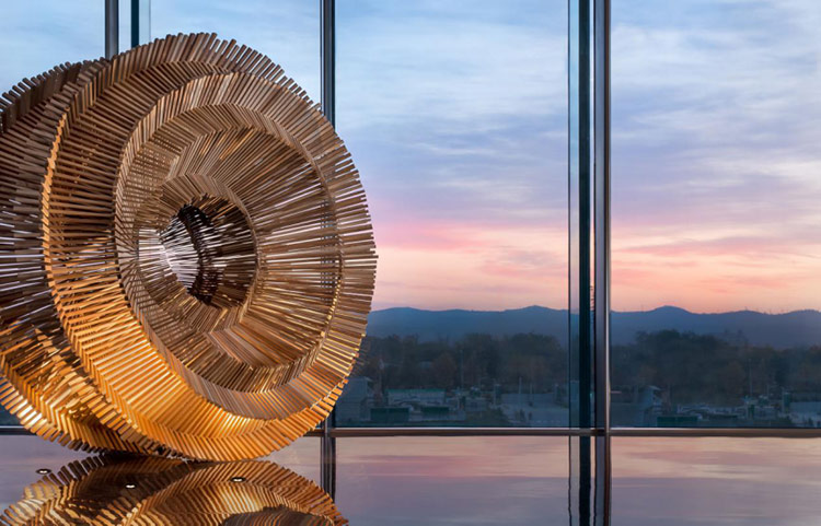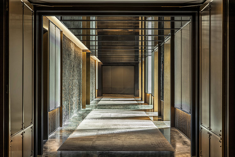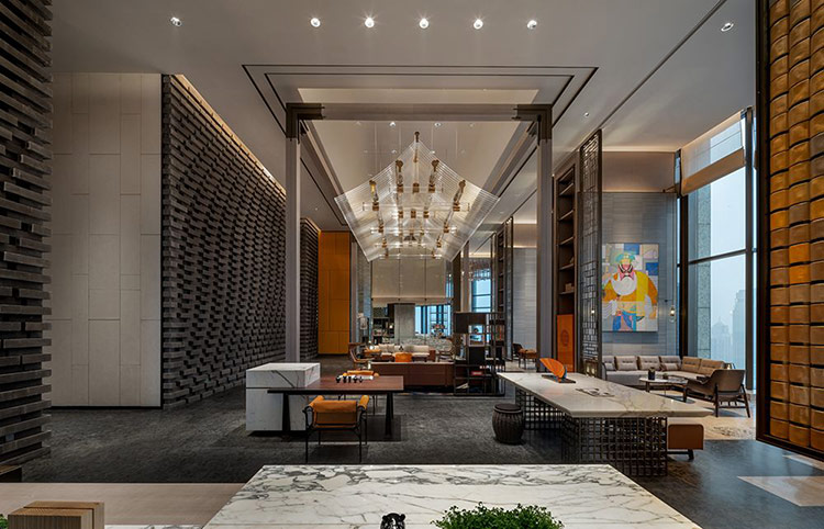 上海佘山世茂深坑洲際酒店建造于原本為采石礦的深坑之上,為了將原始深坑的粗糲質感和周圍自然環境相融合,酒店室內采取“礦·意美學”的理念進行設計,將原生粗獷的巖石崖壁與縹緲雅致的山水自然相結合,打造出專屬于世茂深坑酒店的意境文化。