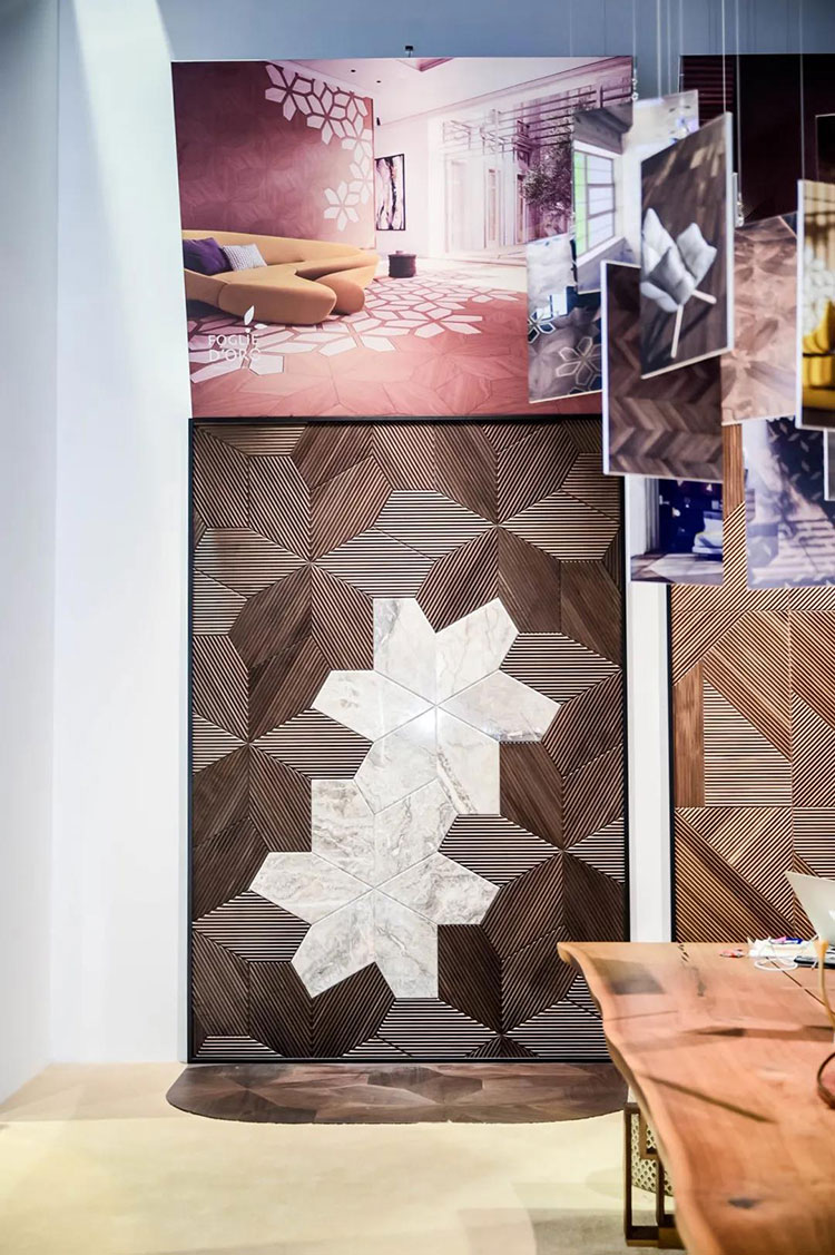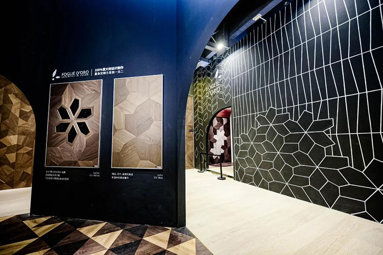 展廳論壇區造型各異的拱形門首先映入眼簾,進入后被大面積的高級黑所圍繞;地面鋪設鋪設獲得了2021紅點設計大獎的必美莫迪里奧Moods系列地板,極具濃厚的藝術氣息;意大利菲列德羅的頂級原創匠作以花朵、幾何、魚骨等賞心悅目的拼接方式驚艷觀眾眼球。