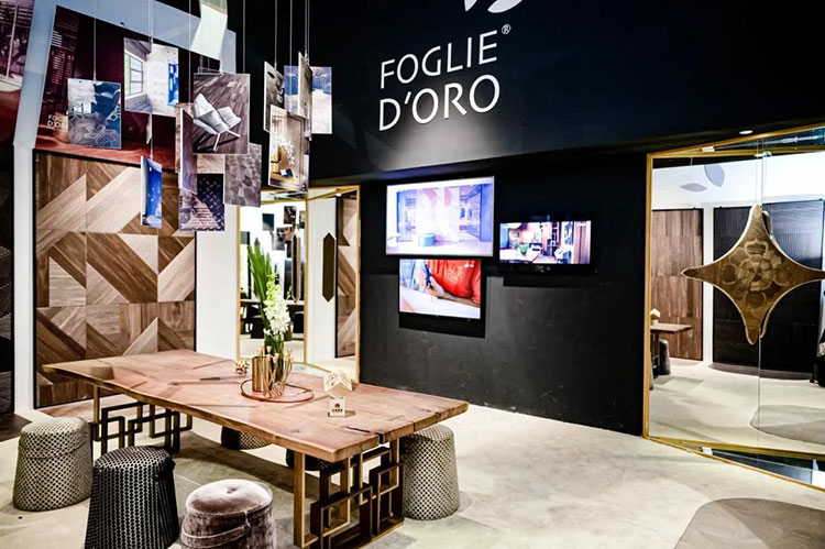 必美地板展廳主打意大利純手工制作的設計理念,從造型、色彩和功能上做了精密設計。整個藝術展廳隨處可見貴族元素,比如,展廳原創手繪墻體上的獨特線條靈感源于意大利奢侈品牌菲列德羅地板的輪廓。阿