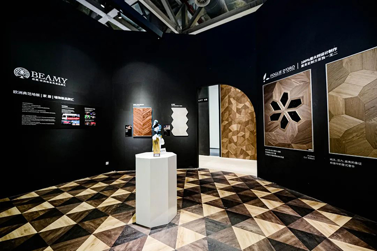 展廳論壇區造型各異的拱形門首先映入眼簾,進入后被大面積的高級黑所圍繞;地面鋪設鋪設獲得了2021紅點設計大獎的必美莫迪里奧Moods系列地板,極具濃厚的藝術氣息;意大利菲列德羅的頂級原創匠作以花朵、幾何、魚骨等賞心悅目的拼接方式驚艷觀眾眼球。
