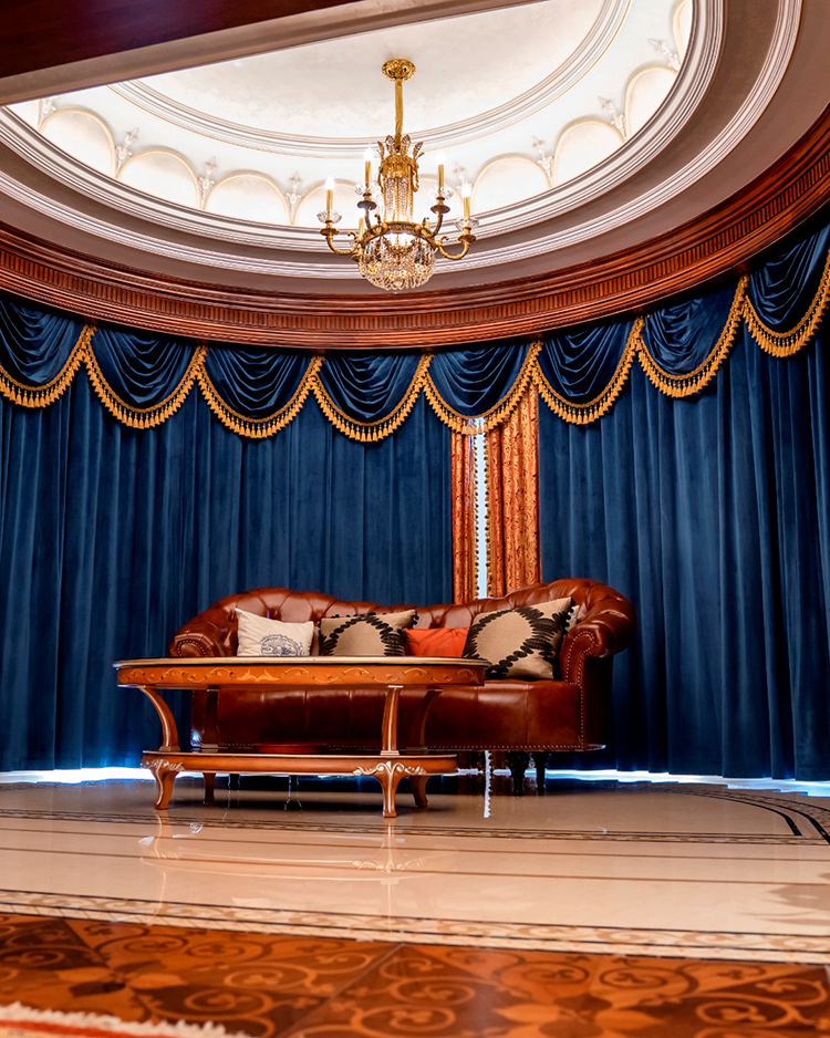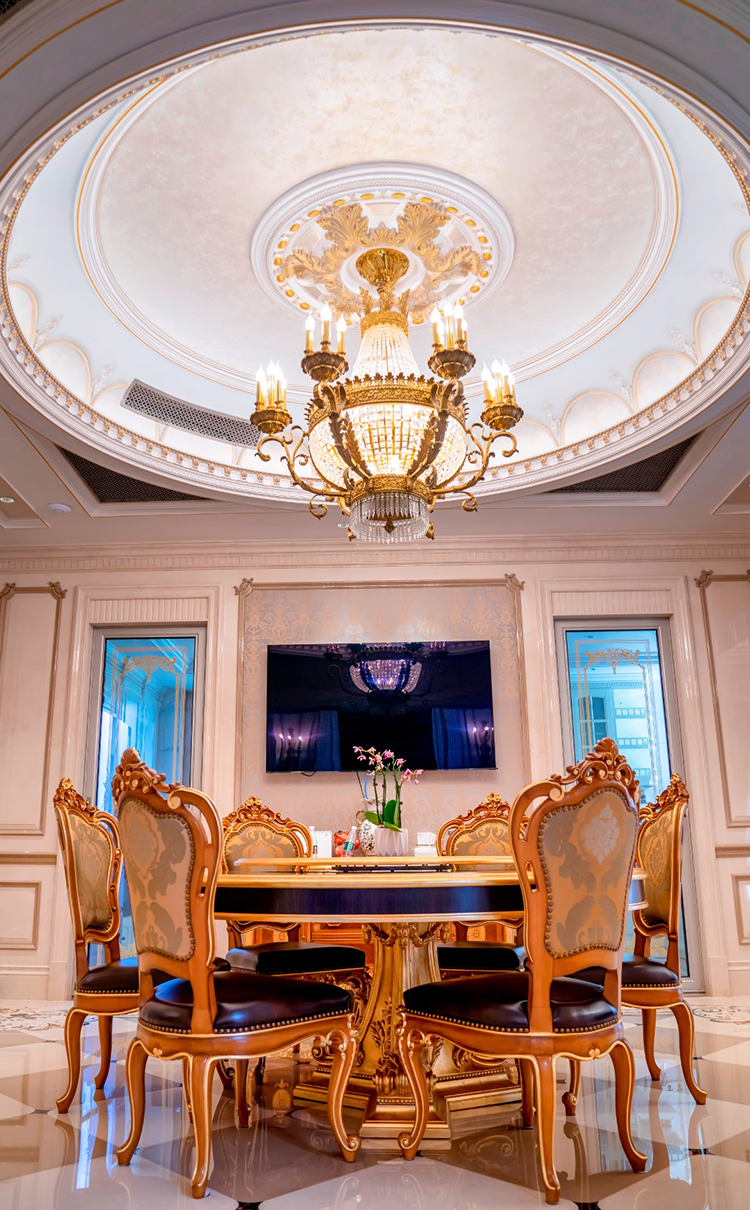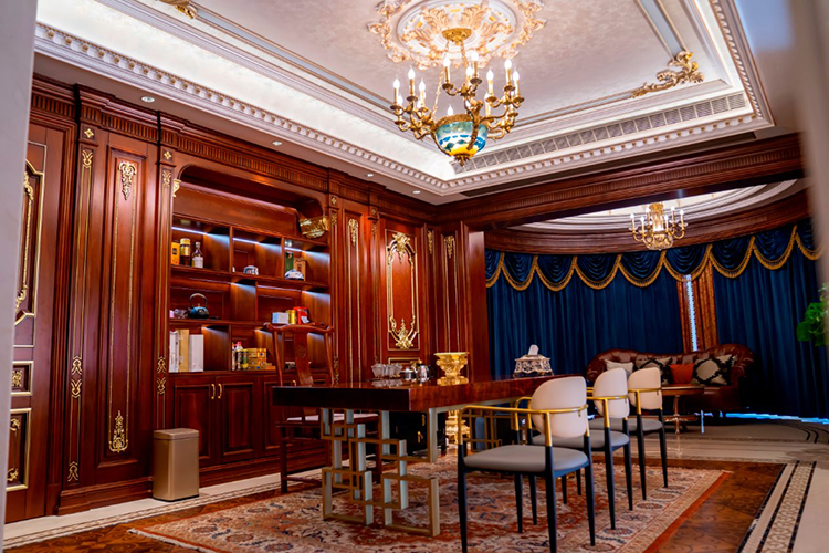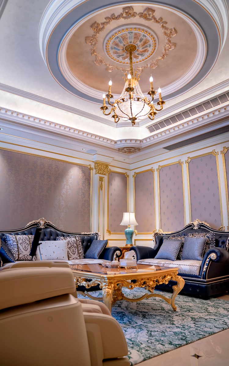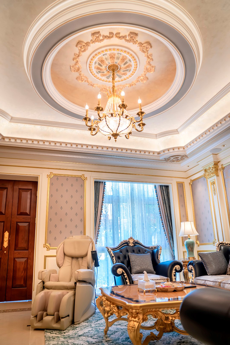 起居室延續一貫的奢華家裝,精致的歐式雕花紋飾無處不在,配套高級按摩椅,給人以極致奢華的享受。