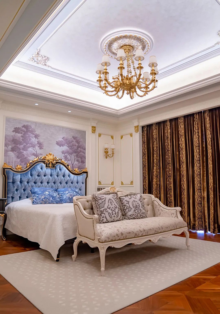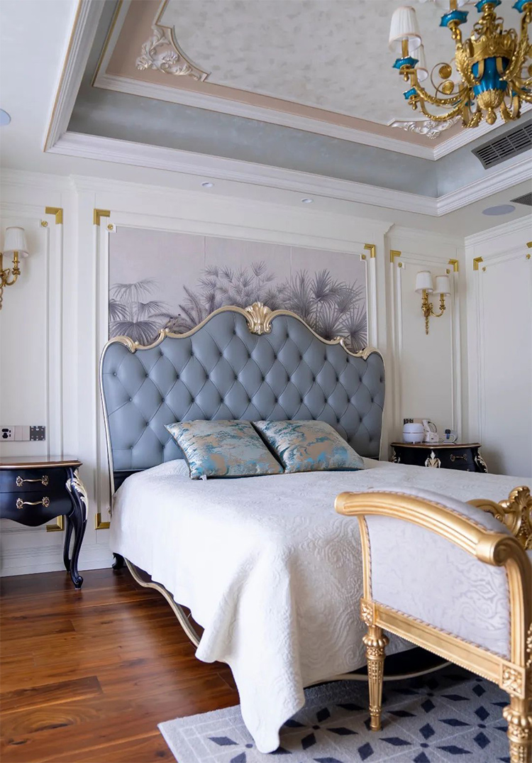 主臥的必美菲列德羅巴多利諾拼花地板,花色靈感來自意大利Bardolino高級葡萄酒,置身于此,給人一種如同品酒般香醇絲滑的體驗和感受。家具和吊燈都帶著金色雕花,奢華感十足;床頭背景墻則采用軟包,渲染出舒適而安逸的家居氛圍。