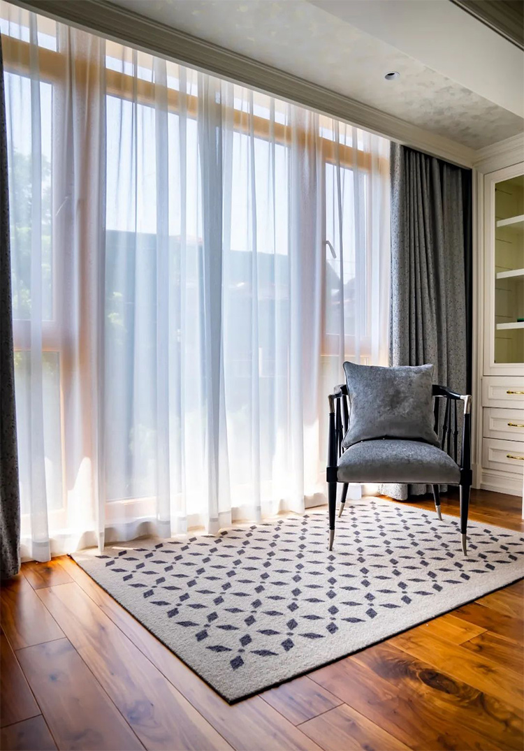 兒子房整體的設計風格,更偏向于低調淡雅的輕奢,利用簡潔的色彩作為基調,加入精致的白金紋飾,地面鋪設必美菲列德羅馬蒂尼鄉村胡桃木為整個氛圍增添自然氣息。