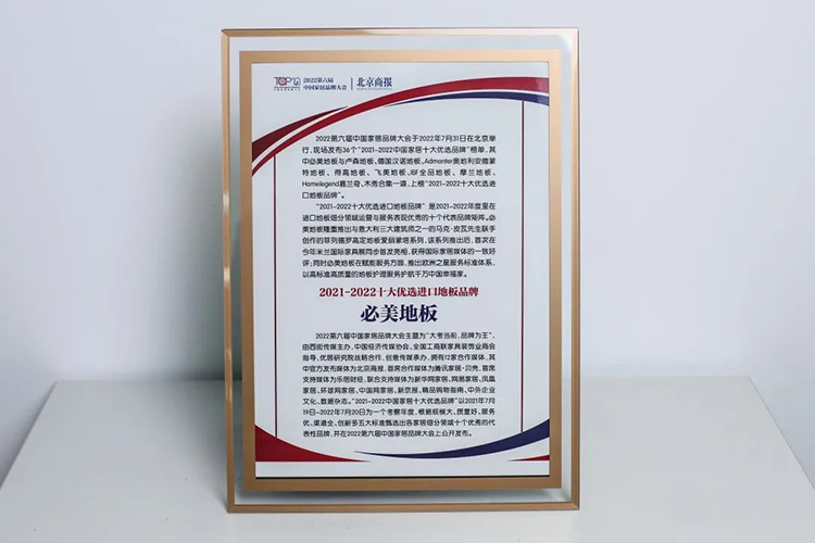 7月31日,由北京商報社、西街傳媒主辦的2022第六屆中國家居品牌大會上,現(xiàn)場發(fā)布36個“2021-2022中國家居十大優(yōu)選品牌”榜單,其中必美地板上榜“2021-2022十大優(yōu)選進口地板品牌”