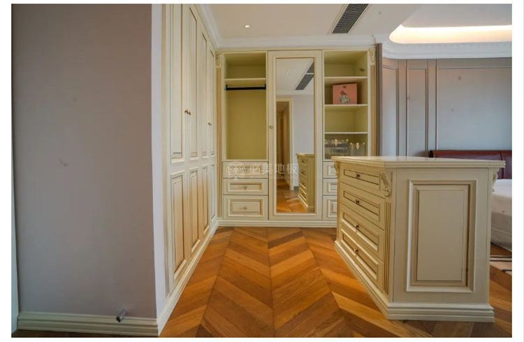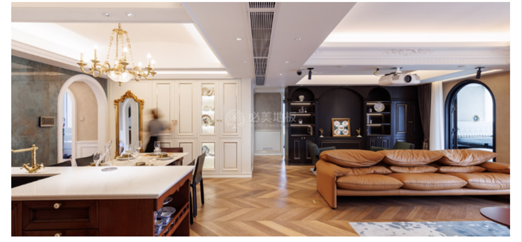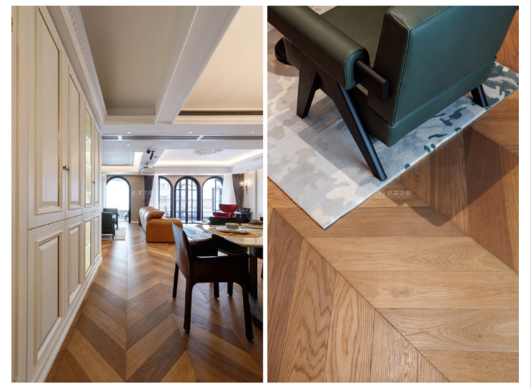 采用魚骨紋的拼法,是因為在這種比較西式的這種空間里面,如果我們以傳統的木地板這種去拼,它相對就沒有那么出彩。那魚骨拼的這種做法,第一個是空間的層次感,第二這種地板的質地比較適合這種方式去表達。