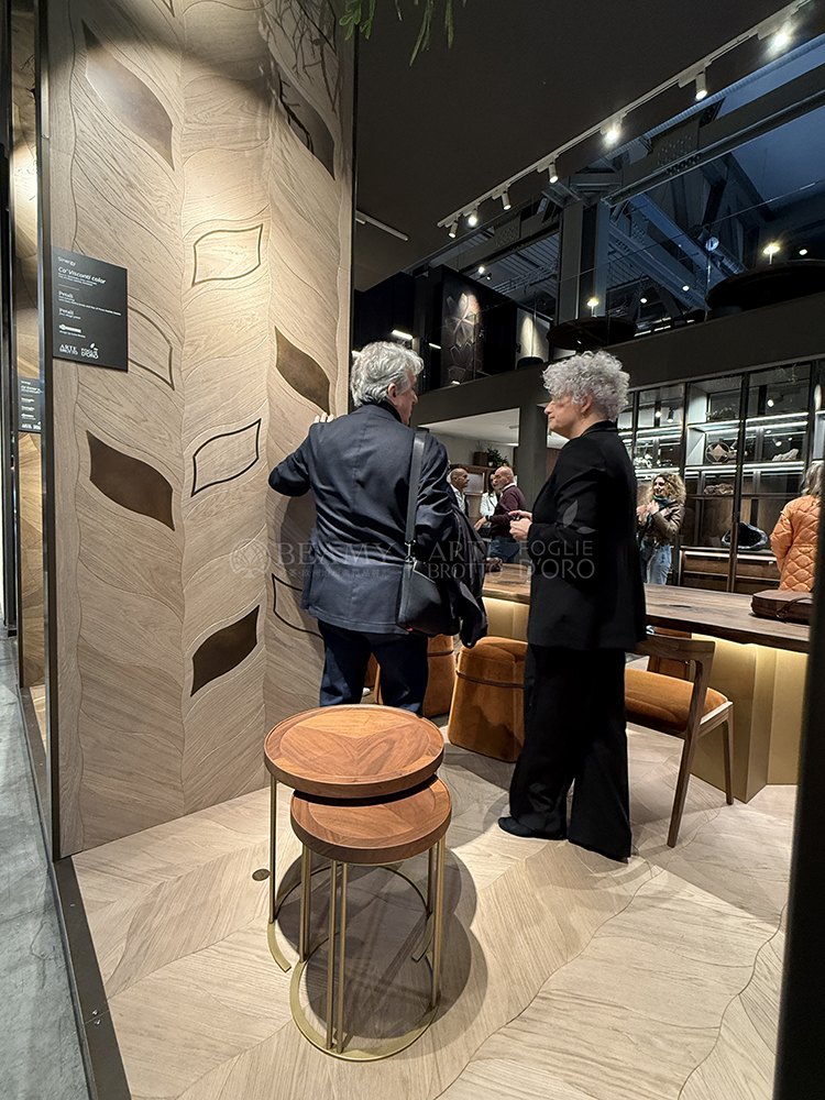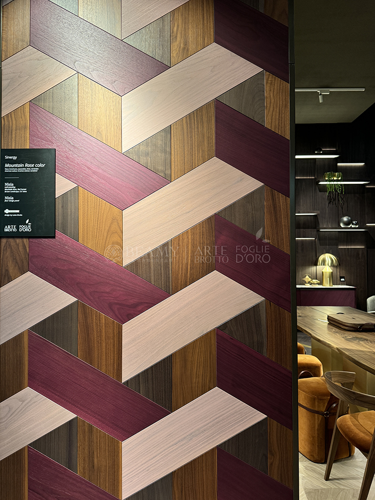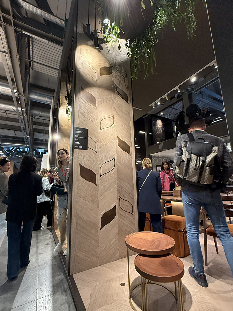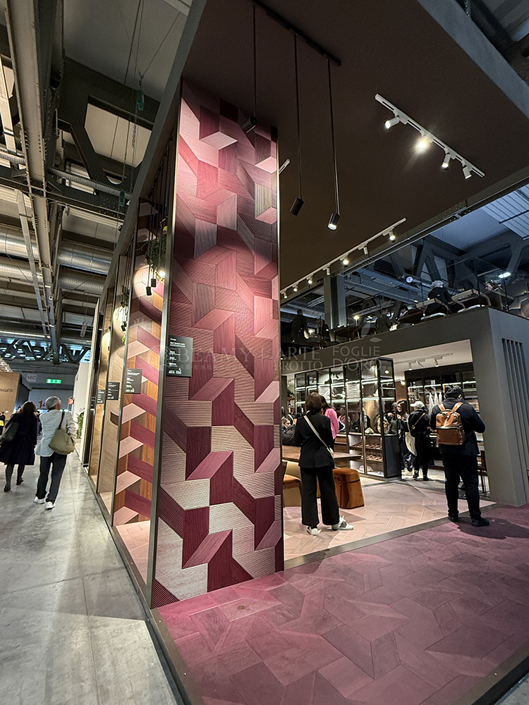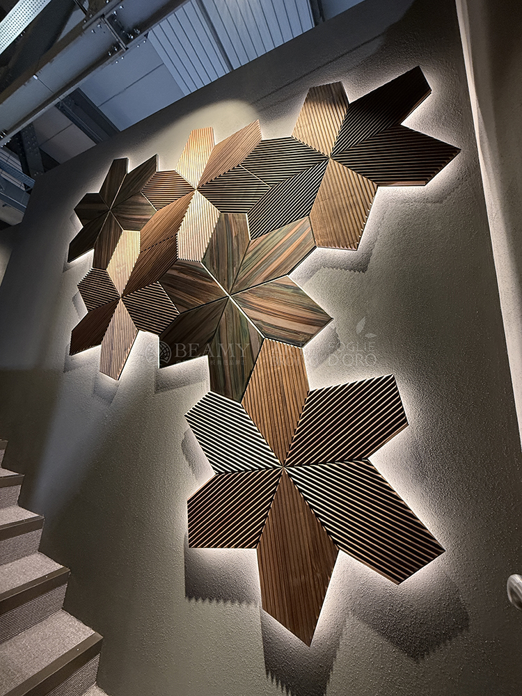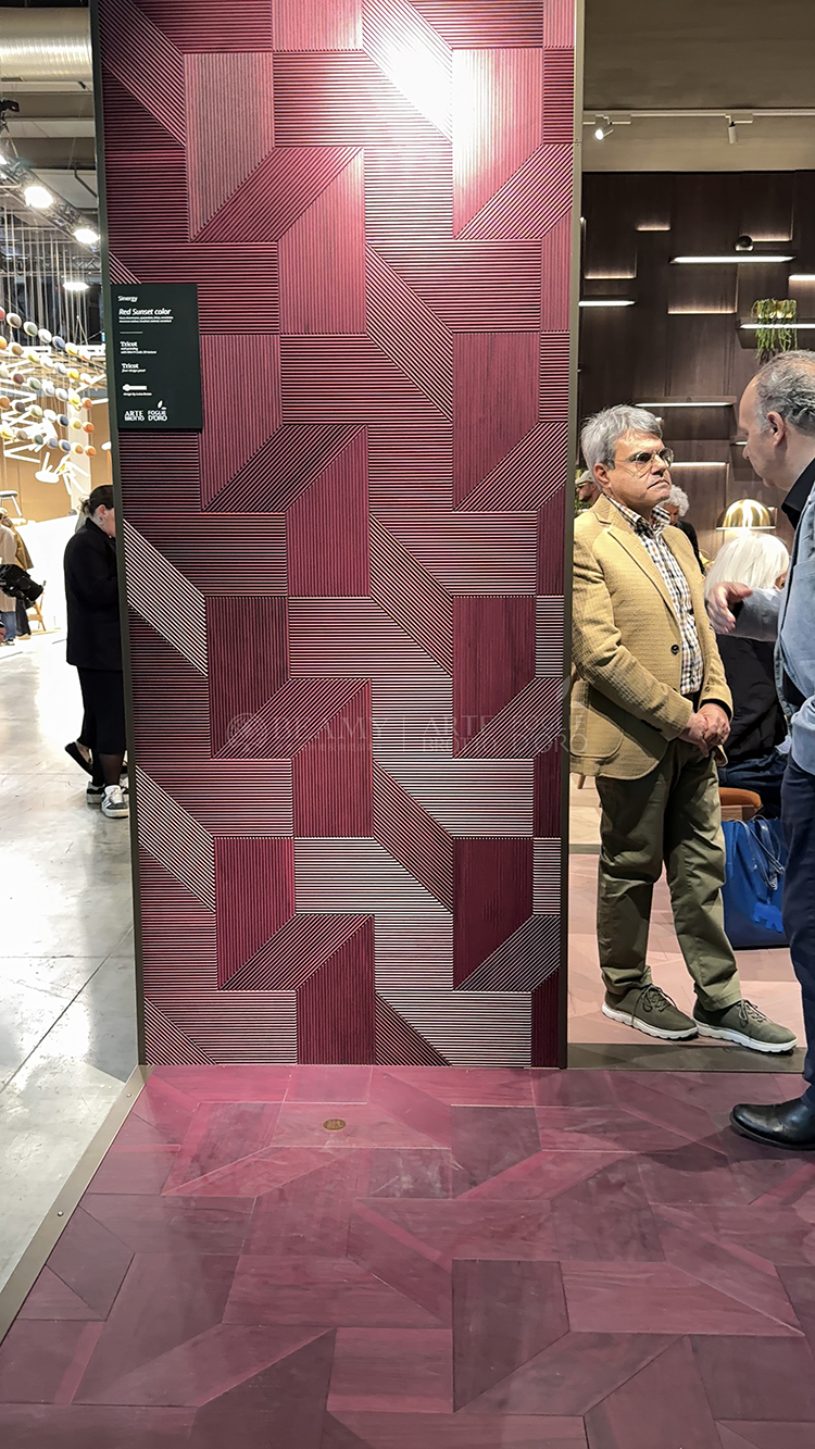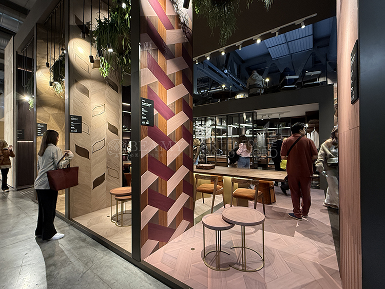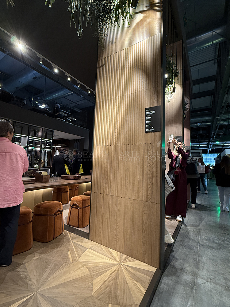 在展廳二樓部分的Azalea拼花墻板也在市場(chǎng)首次展示,這款特殊的效果是金屬經(jīng)過(guò)氧化而成的,3D立體的視覺(jué)效果,邊緣有特別的V槽設(shè)計(jì),結(jié)合了全新的鋼材元素,5毫米厚的金屬將鋼材的V槽延伸過(guò)渡到了木質(zhì)的部分,是由必美菲列德羅獨(dú)家發(fā)明的產(chǎn)品。