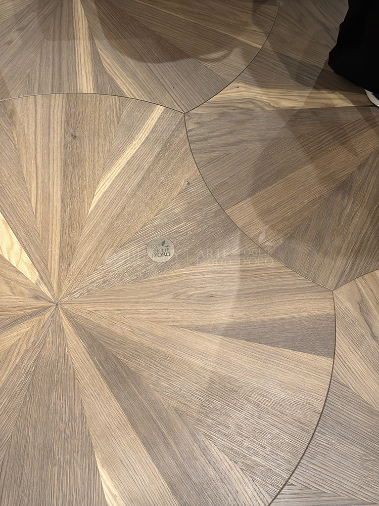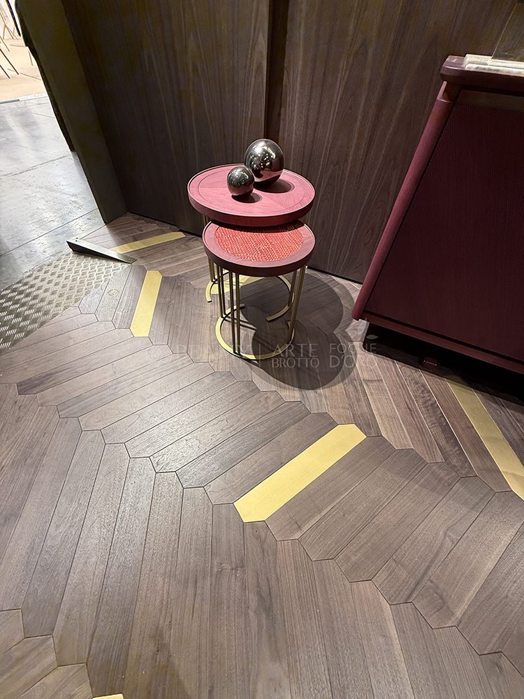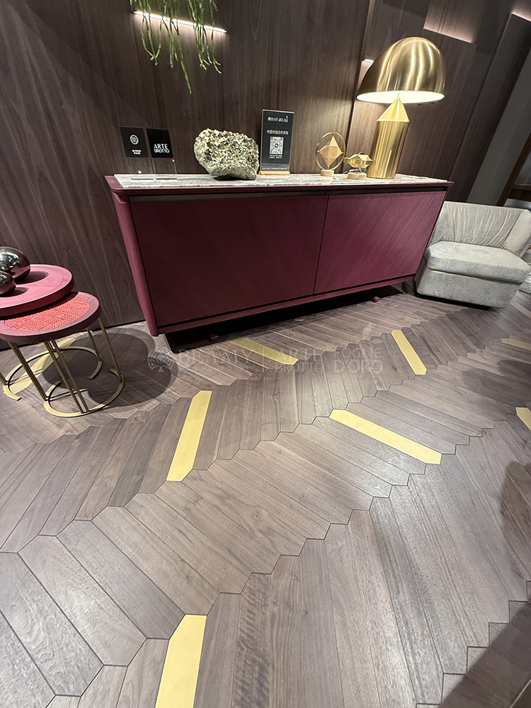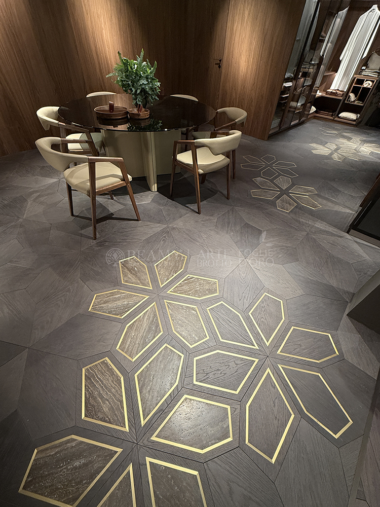 這款全新推出的Azalea拼花地板使用了一款橡木的顏色搭配了黃銅的線條以及奢石的鑲嵌,Travertino Titanio是來(lái)自意大利的奢石,經(jīng)過(guò)特殊處理做成了啞光的飾面,為家庭空間賦予了非常高端的效果。