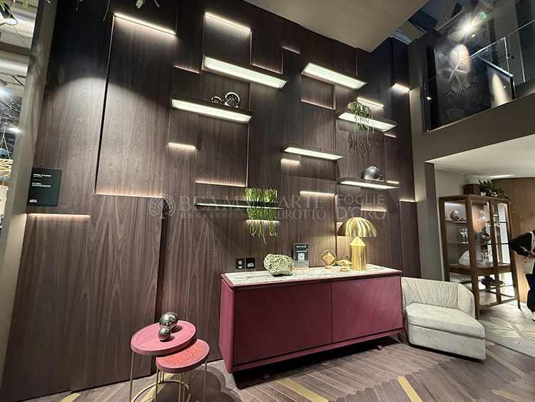 “通過(guò)黃銅顏色和木材顏色相結(jié)合,卡塞爾瓦花色的胡桃木加入幾片黃銅顏色作為點(diǎn)綴與墻上這款翠貝卡墻板相呼應(yīng)。”