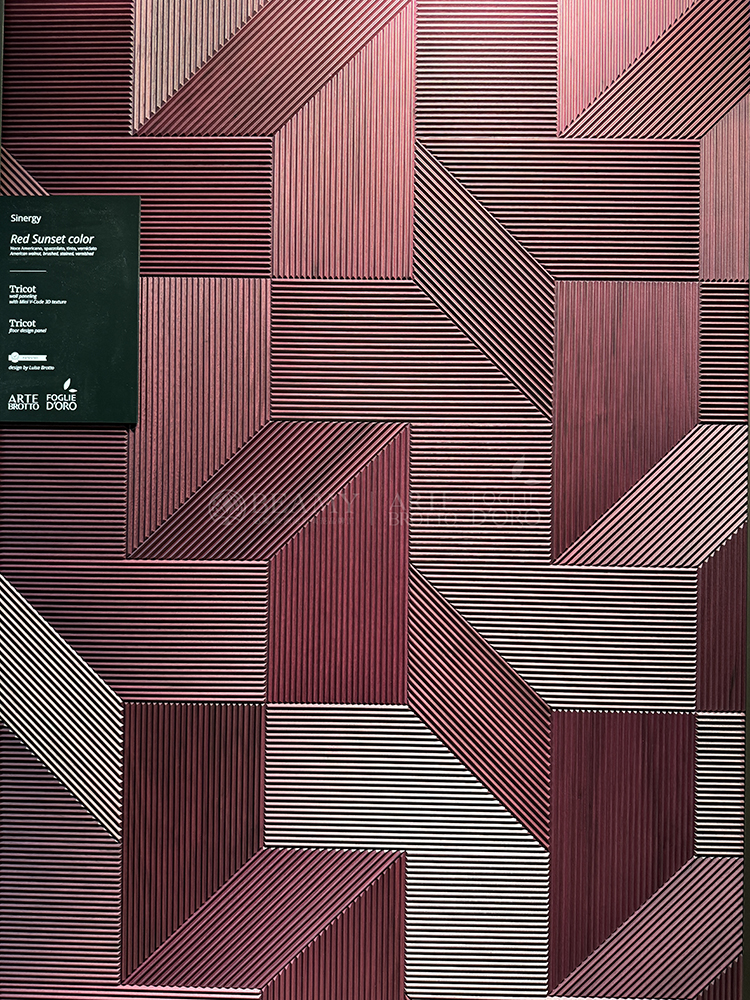 “這款拼花將不同的圖案組合成編織紋理,我們希望傳達(dá)的概念是,我們能夠?qū)⒁恢碌念伾\(yùn)用在家具作品上、墻板作品上,可以通過(guò)不同密度的凹槽,打造出不同的墻板紋理。