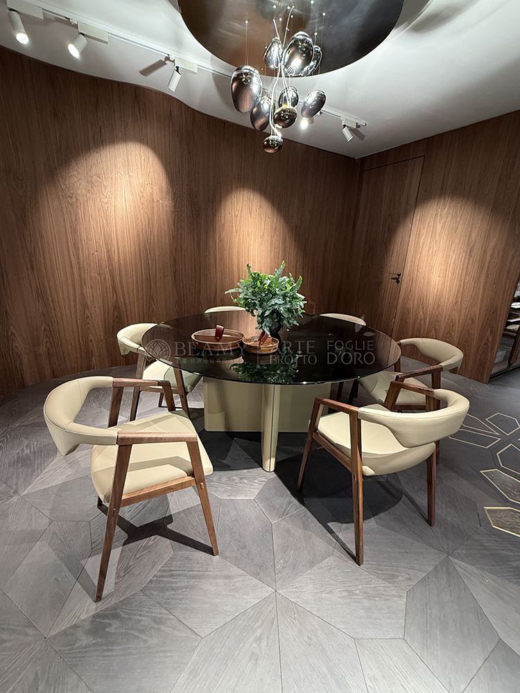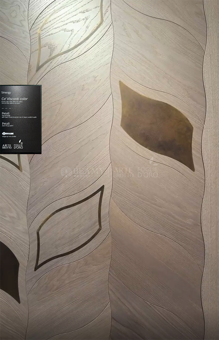 Petali拼花運(yùn)用了自然的色差結(jié)合金屬材質(zhì)及手工制作的黃銅線條和板塊,每件產(chǎn)品都是獨(dú)一無(wú)二的,在空間氛圍中賦予了所有的色彩和感覺(jué)。