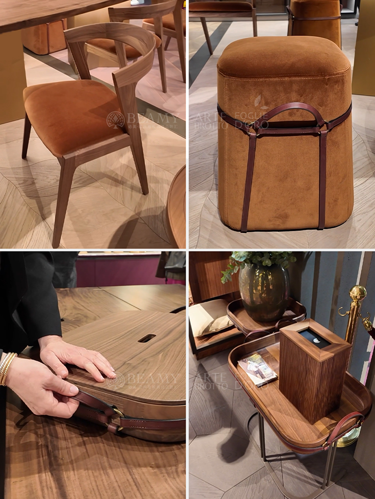 “我們制作的家具是實(shí)心的胡桃木切割出的完整曲線形狀,提手是一家為馬制作裝飾品的公司提供的,也成為是這件家具作品中的一個(gè)獨(dú)特細(xì)節(jié),而同款的皮革細(xì)節(jié),您可以在托盤(pán)中找到,對(duì)于細(xì)節(jié)的品質(zhì)把控,從而為每一件家具作品賦予魅力。”