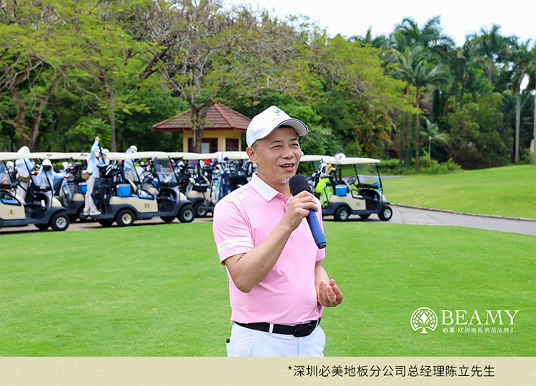 深圳必美地板分公司總經理陳立先生上臺致辭,通過一個高爾夫球國際知名球星的高球生涯勉勵同行,并表示“必美地板,祝愿在座的每一位伙伴,都贏得自己的人生大滿貫!”