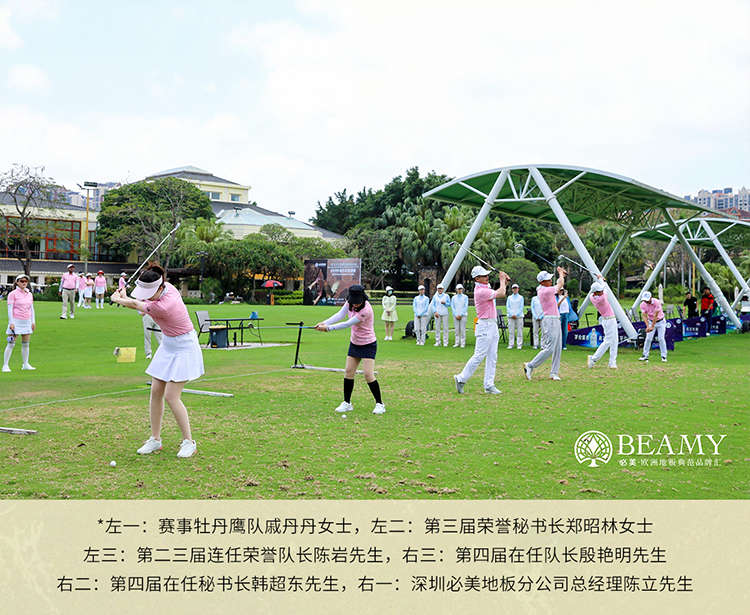 綠茵場上,由6位嘉賓開球揮桿出球∶深圳必美地板分公司總經理陳立先生、第二三屆連任榮譽隊長陳巖先生、第四屆在任隊長殷艷明先生、第三屆榮譽秘書長鄭昭林女士、第四屆在任秘書長韓超東先生、本次賽事牡丹鷹隊戚丹丹女士作為開球嘉賓,為本次賽事開出了第一桿!