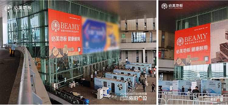 必美地板今年的出場方式格外引人注目,堪稱豪橫!在南大廳的觀眾入口處,必美外場廣告占據了最核心的C位,彰顯著品牌影響力。巨大的廣告牌在眾多品牌中脫穎而出,吸引著每一位過往觀眾的目光。