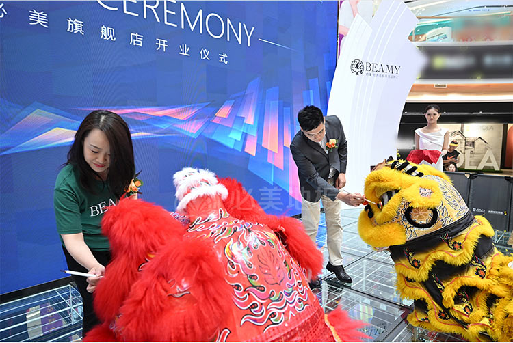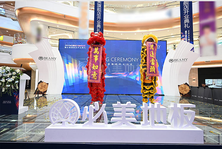當天,吉林省室內裝飾協會秘書長賈秀波先生、吉林省裝飾協會楊震宇先生、居然智家太陽城店營銷管理部負責人赫明剛先生、吉林省室內裝飾協會大宅設計專家委員會專家/叁委會執行主委/宮空間設計機構創始人宮海寧先生、必美國際集團品牌運營總監譚天謙先生、必美國際集團東北區域總經理梁志全先生、長春必美地板總經理馬丫女士、長春必美地板銷售總監宋啟軒先生等嘉賓一行鼎力助陣本次開業盛典,共同為必美新店舉行了隆重的剪彩和醒獅點睛儀式,禮花齊放,嘉賓齊賀生意興隆!剪彩過后,眾嘉賓和客戶一起參觀必美美輪美奐的新展廳,共同欣賞高奢地板藝術與美感的魅力。