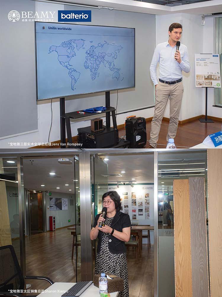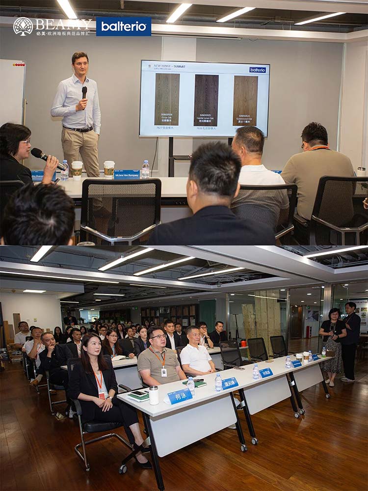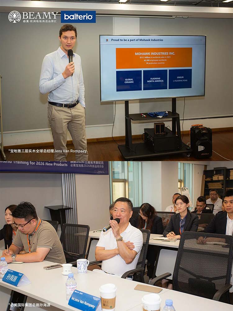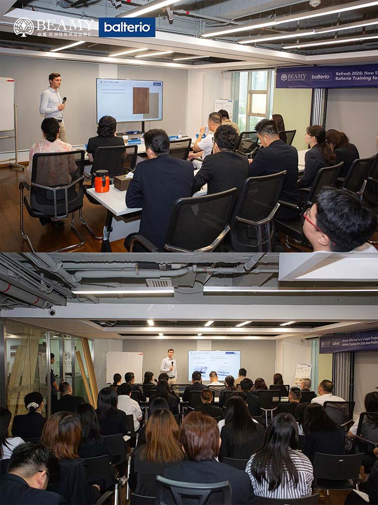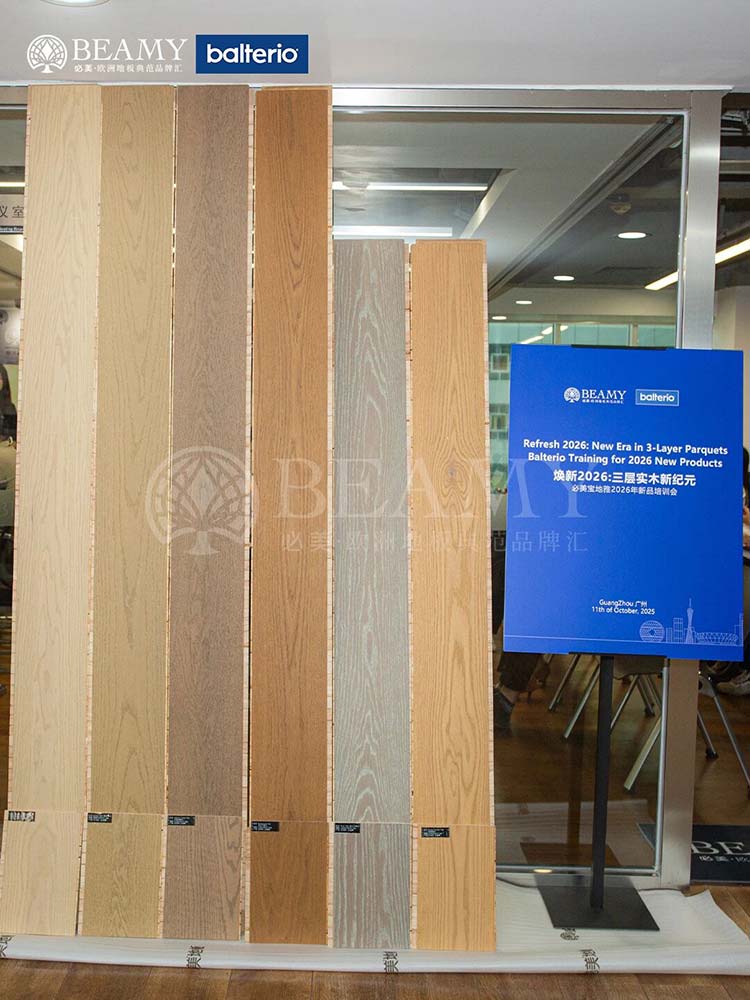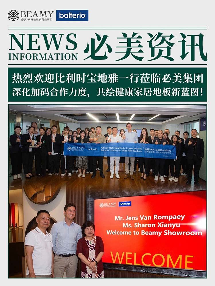 此次寶地雅中國之行,遠不止于參觀交流。雙方就未來產品趨勢、健康家居生活體驗升級等關鍵議題,進行了全面而深入的探討。訪問次日,一場以“煥新2026:三層實木新紀元”為主題的寶地雅2026新品培訓會在必美集團總部隆重舉行。這場前瞻性的新品品鑒與培訓會,全球范圍內首次提前揭開了寶地雅未來在三層實木地板產品技術革新與設計風尚的神秘面紗,更為雙方后續的市場推廣奠定了堅實的基礎。