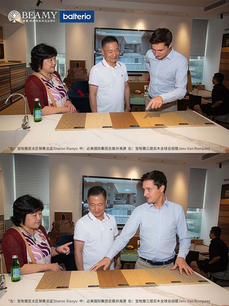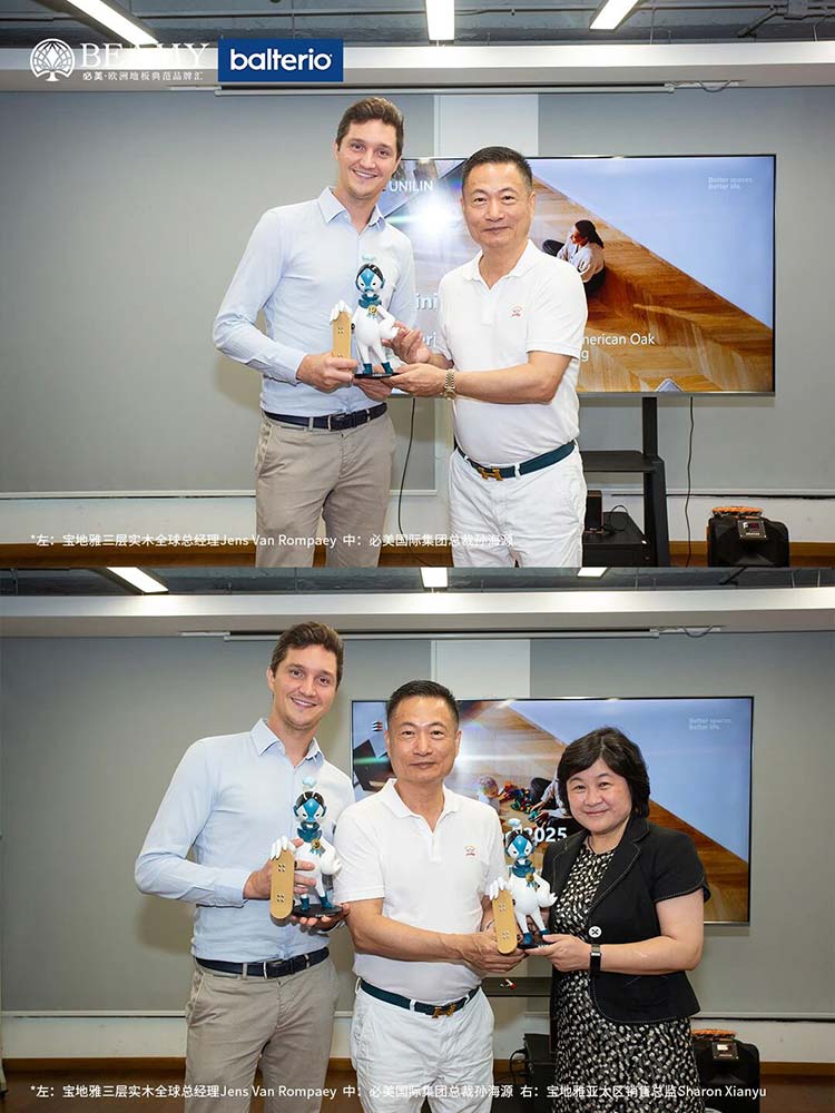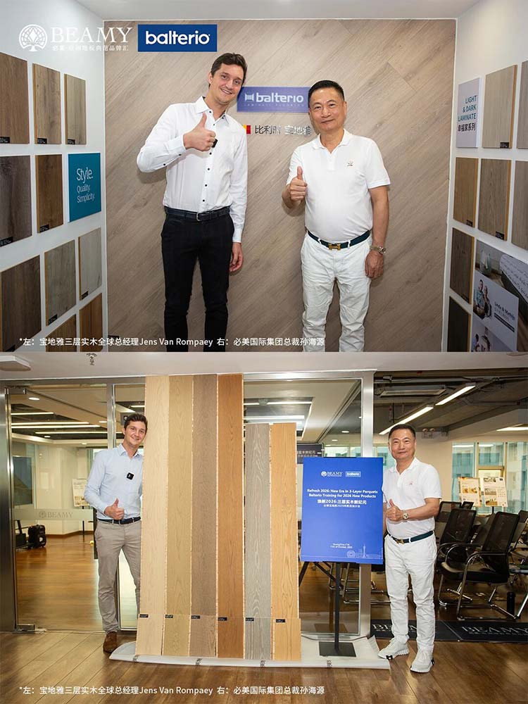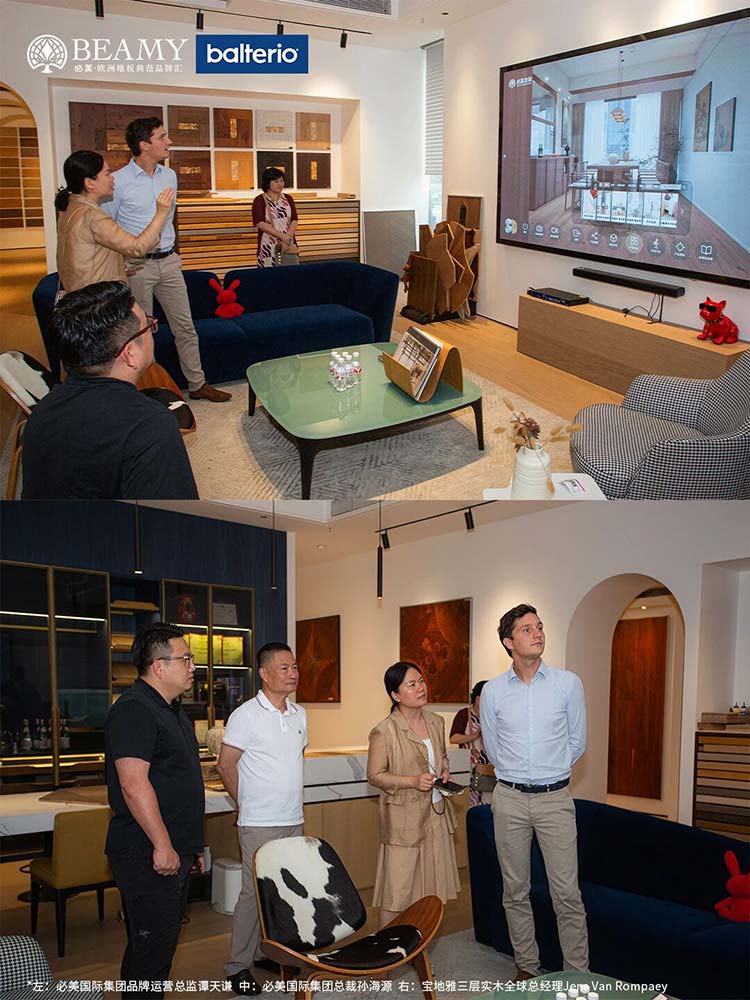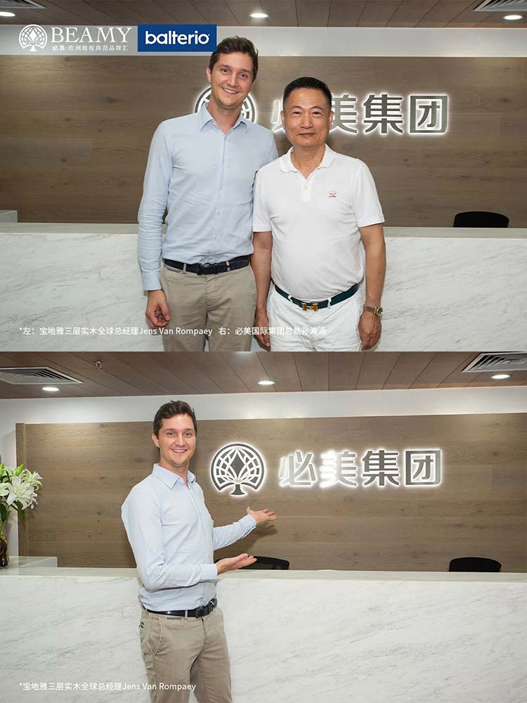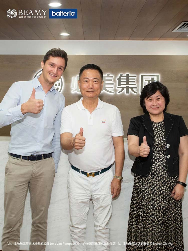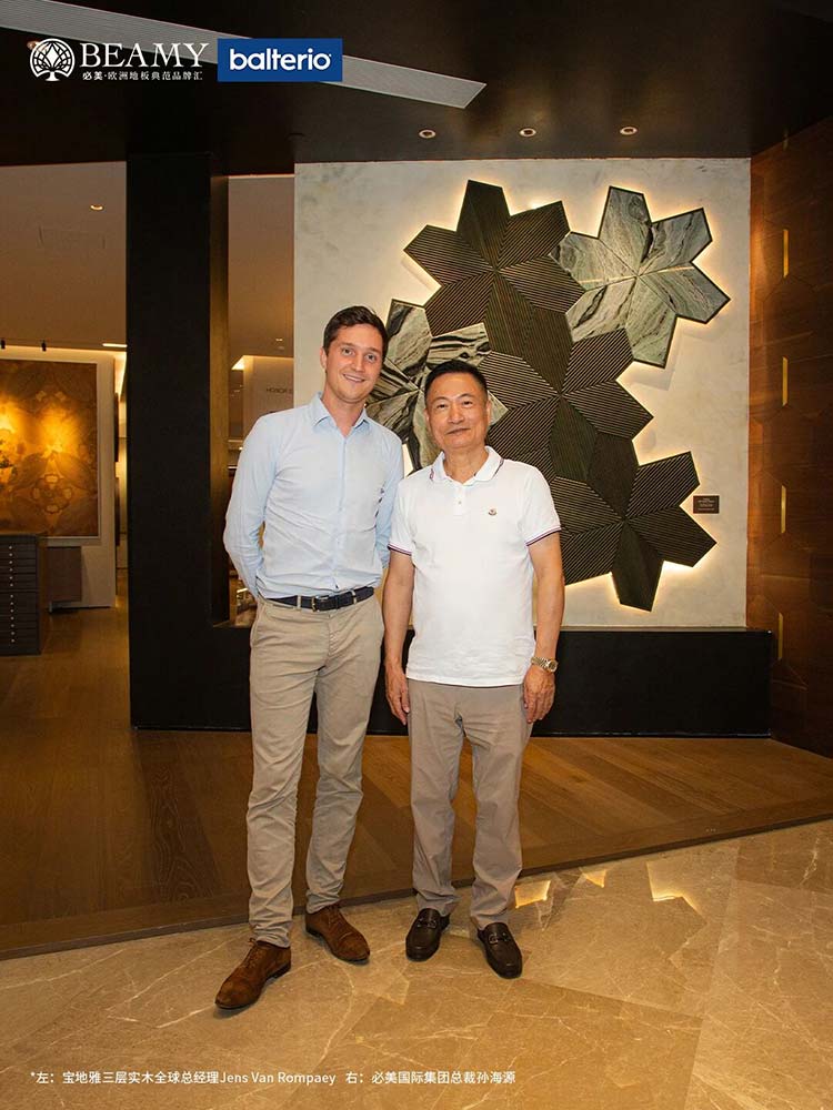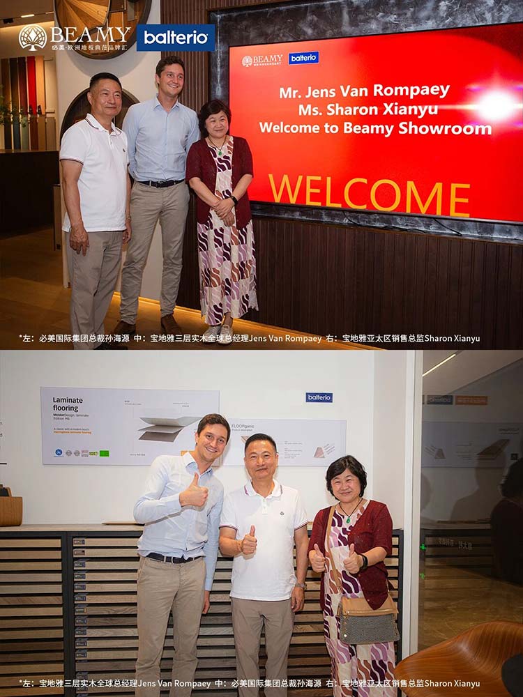 熱烈歡迎比利時寶地雅一行蒞臨必美集團,三層實木煥新系列全球首發,共繪健康家居地板新藍圖!10月10日,寶地雅三層實木全球總經理Jens Van Rompaey先生與寶地雅亞太區銷售總監Sharon Xianyu女士在必美國際集團總裁孫海源先生、必美國際集團品牌運營總監譚天謙先生的陪同下,共同走進必美地板羅浮宮店,開啟一場關于健康、藝術與可持續的深度對話。