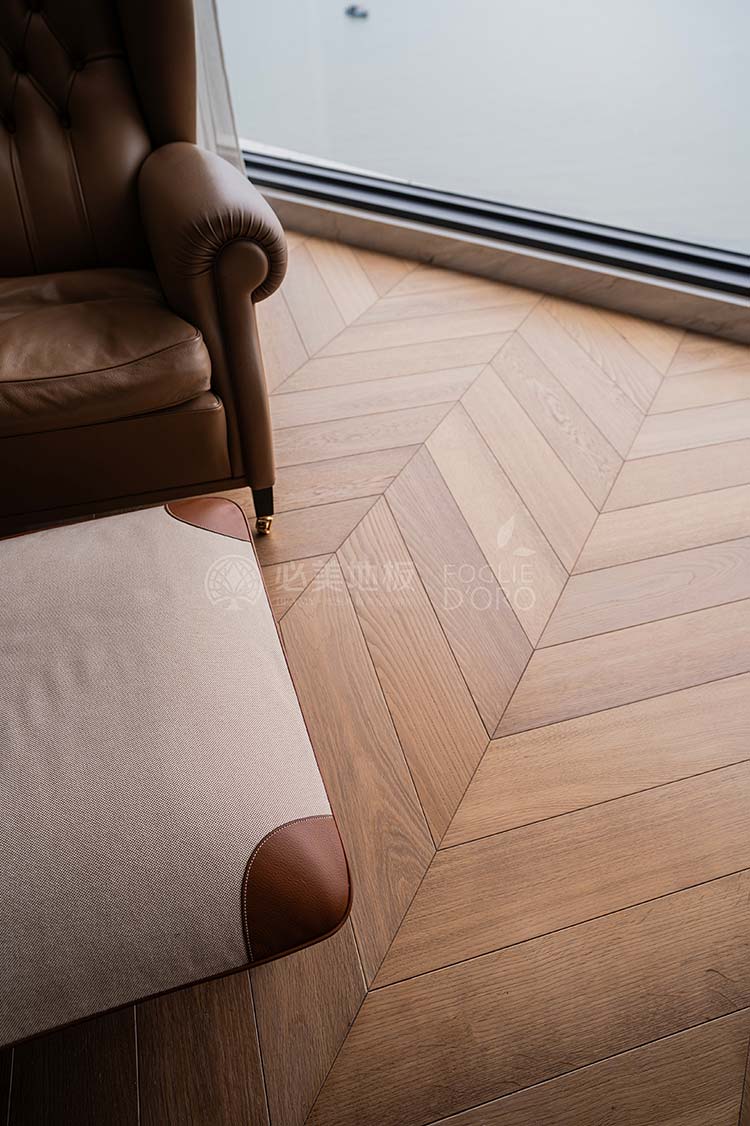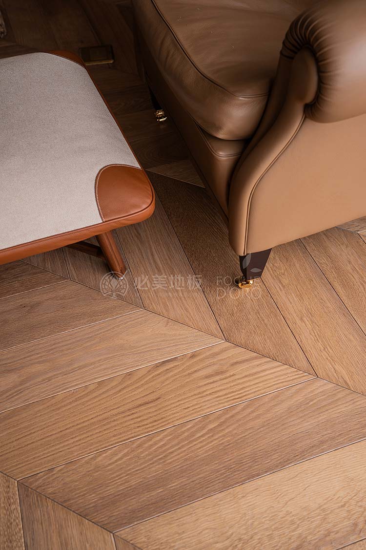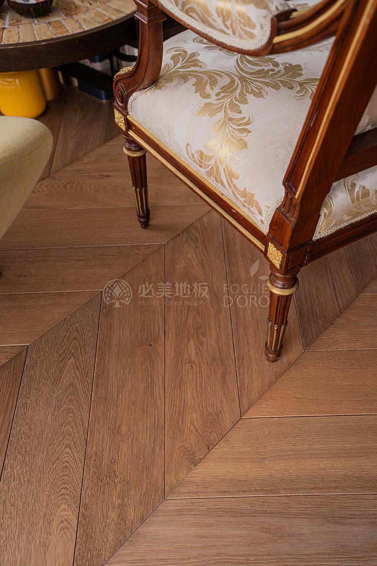 必美菲列德羅意大利手工定制木地板以經典魚骨拼鋪設,以木質自然色調為基準,搭配魚骨拼拼法,讓整體空間彌漫著質樸與醇厚的氣息。