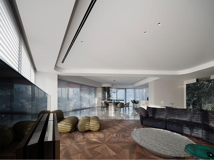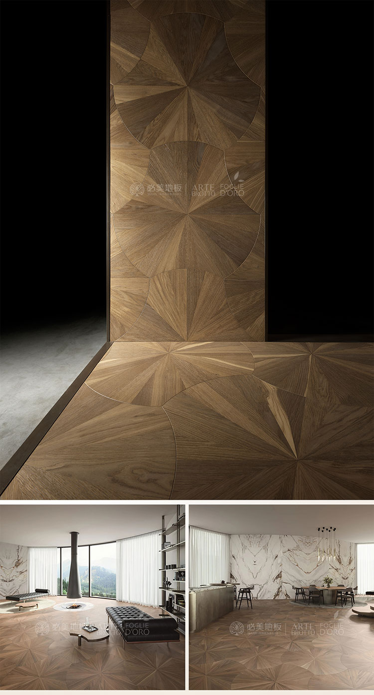 此外,印象拼花的精髓并非簡單的幾何圖案——其真正的精髓在于對每塊木材紋理的精心篩選與組合,使整體呈現出從一個點向外蔓延的光輝,是力量內蘊的釋放,是信念與哲學的感知。