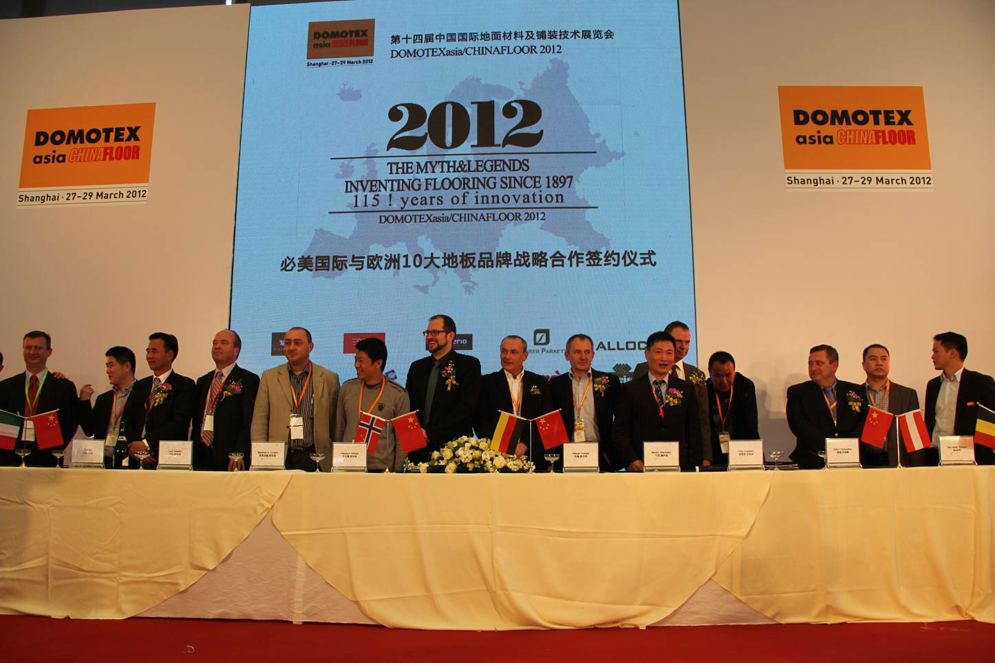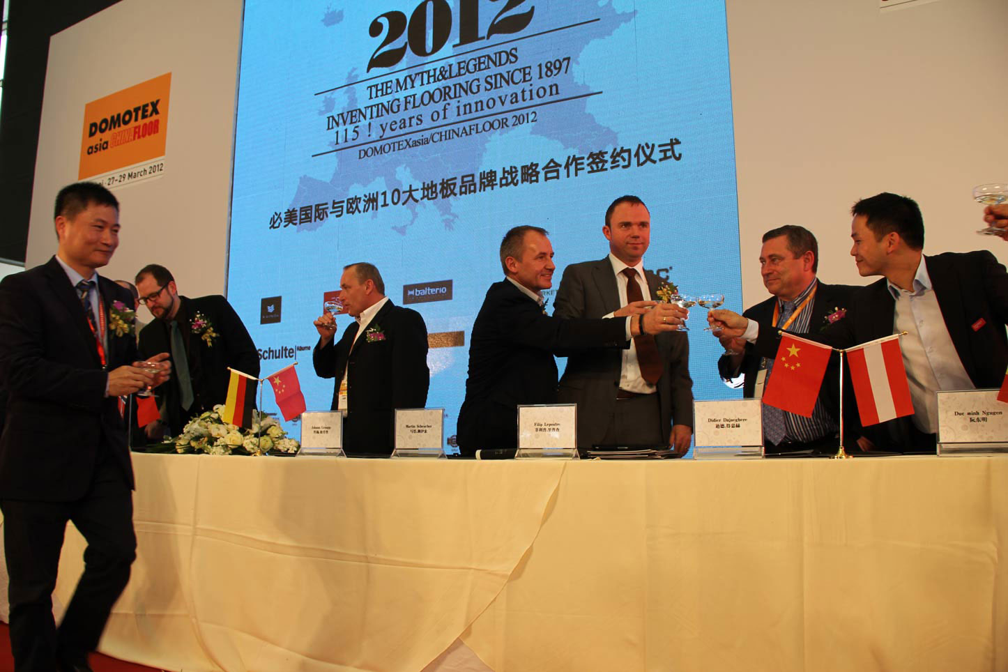 2012年3月27日,上海新國際博覽中心南大廳《第十四屆中國國際地面材料及鋪裝技術展覽會》開幕式剛剛落下帷幕,必美國際與歐洲10大頂級地板品牌戰略合作及獨家總代理協議簽約儀式盛大召開,來自德國、奧地利、意大利、挪威、比利時等十大歐洲頂級地板百年品牌、歐洲規模最大的木業集團及上市家居集團與必美國際聯合組成開拓中國最頂尖高端地板市場的歐洲強勢品牌戰略聯盟。歐洲十大品牌共100多款2012年歐洲最新最頂尖的巔峰產品在必美國際展臺璀璨亮相,在這場國內規模最大的建材行業盛宴上盡展光芒四射的領袖風采。中央電視臺、搜狐網等眾多國家權威媒體出席并采訪了現場簽約儀式。