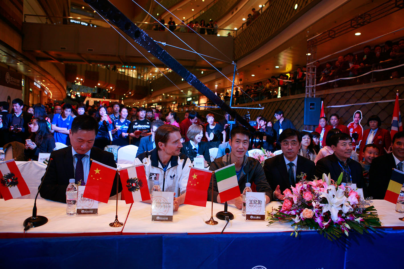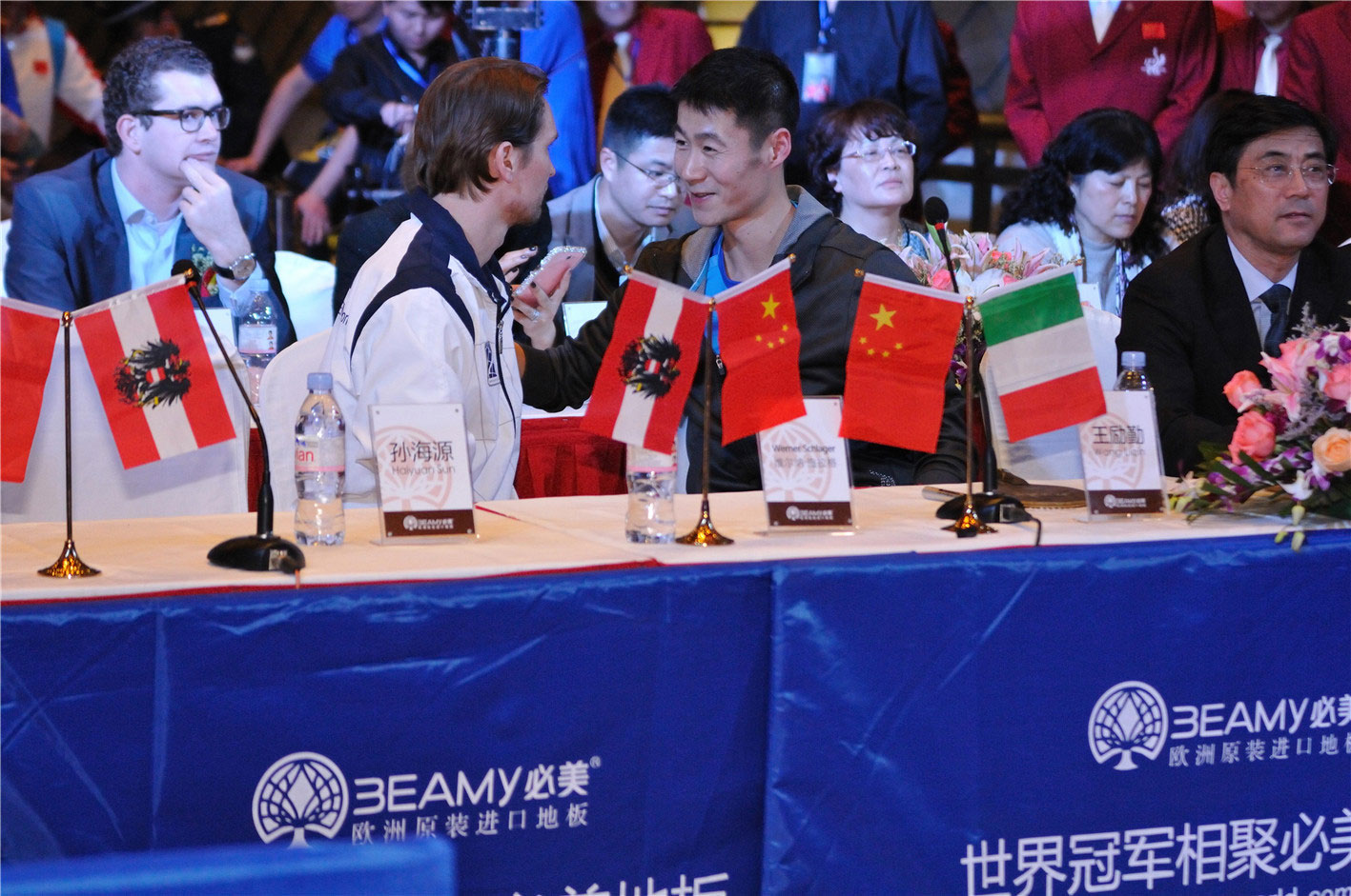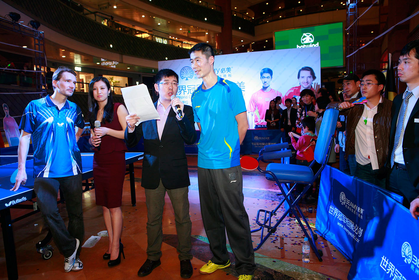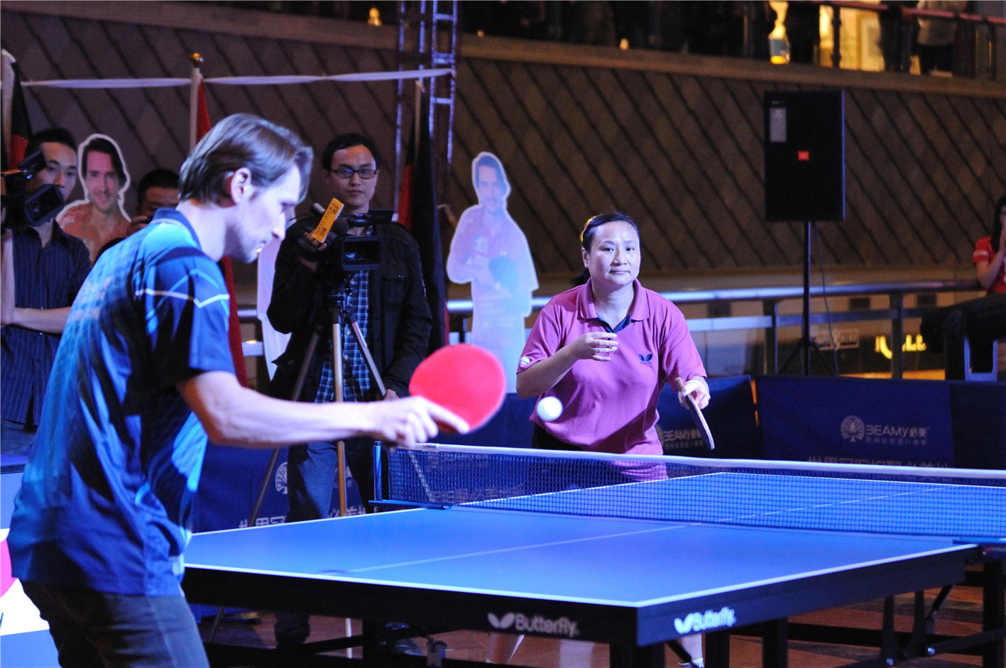 活動當天雖然天氣稍冷,但并沒有冷卻乒乓球球迷們的熱情,500多名粉絲聚集一睹乒乓球世界冠軍維爾納.施拉格以及國乒之光王勵勤的風采。整場活動精彩紛呈,白天有激烈的民間高手初賽選拔,優勝者在晚上與必美地板形象代言人乒乓球世界冠軍維爾納.施拉格同臺比拼。